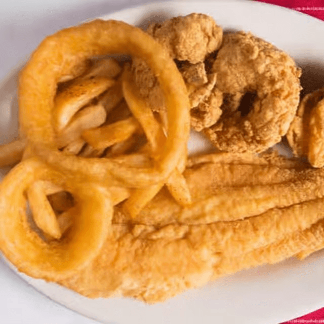 2 piece fresh fried catfish and 12 jumbo colossal shrimp served with fries or onion rings.