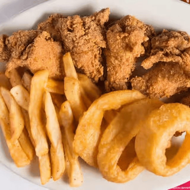 2 pieces. Tasty fried chicken tenderloin strips dipped in special batter, fried golden brown, and served with seasoned fries or onion rings. With your choice of dipping sauce.