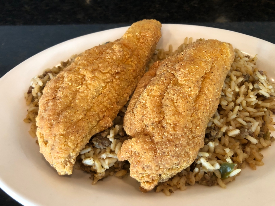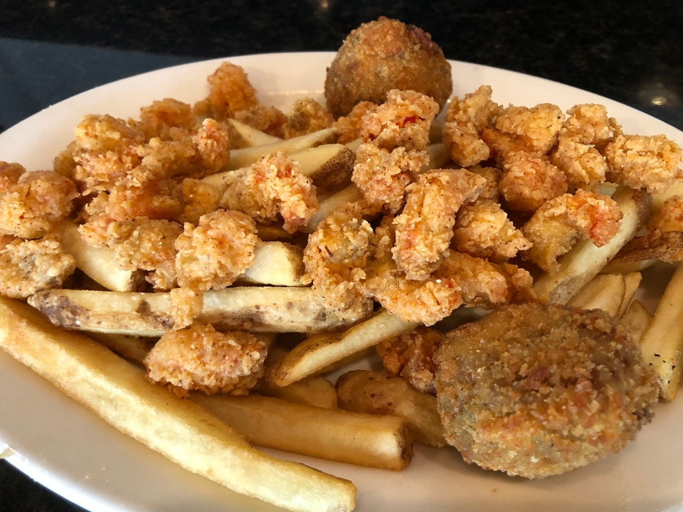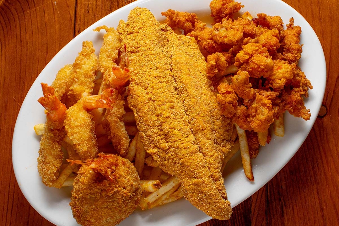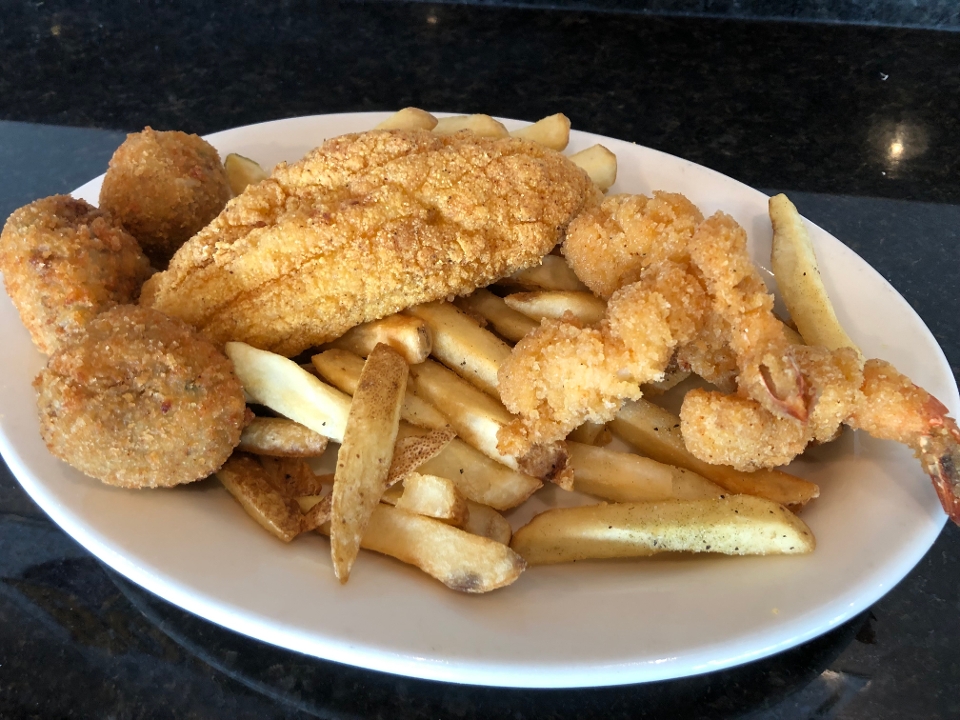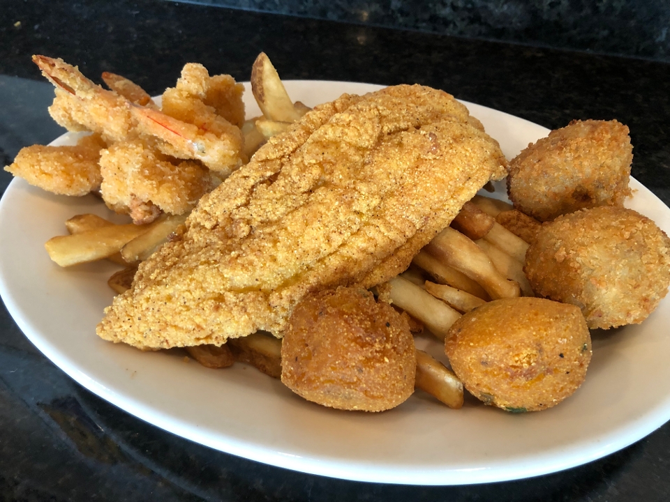 (1) Mississippi Farm-raised fresh catfish filet, (2) fried shrimp, (3) boudin balls
