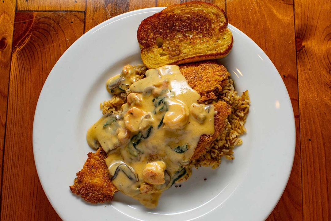 Pecan crusted Mississippi Farm-raised fresh catfish topped with shrimp, crawfish, spinach and mushrooms in a homemade cream sauce, served with Cajun rice