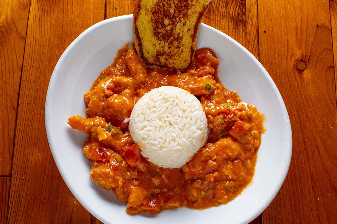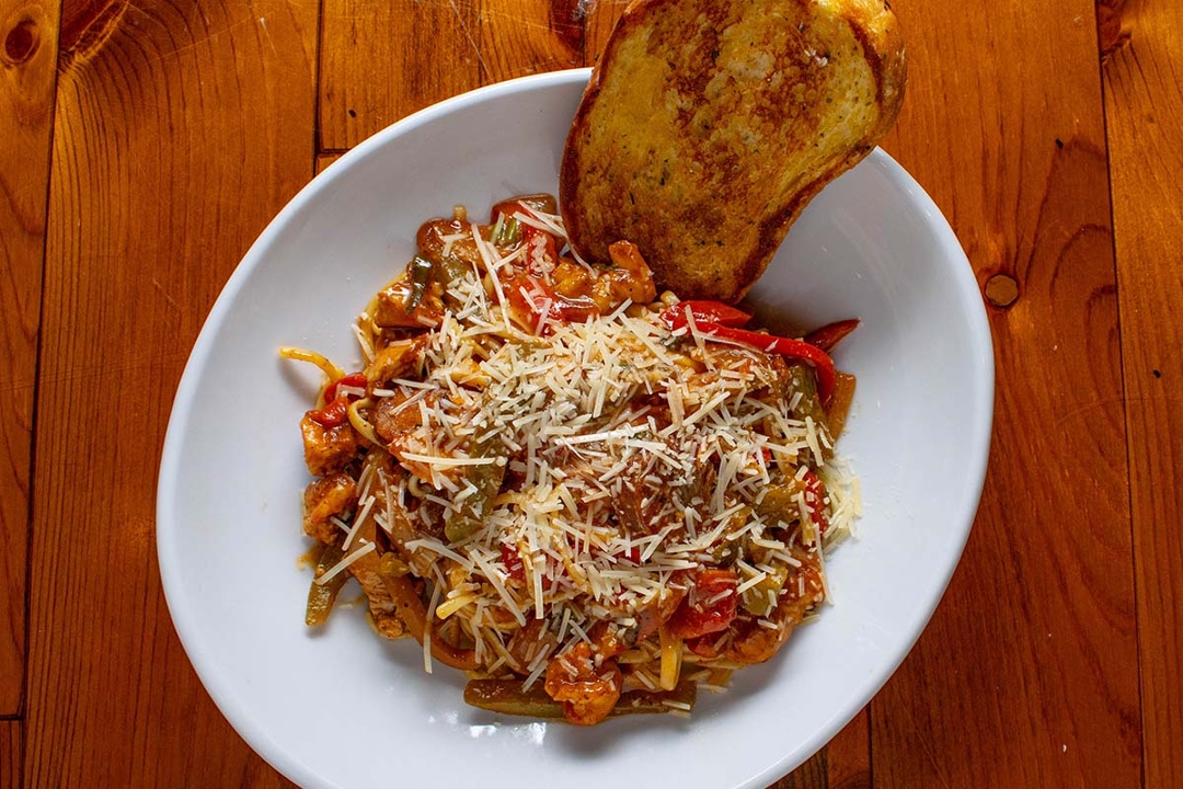 Chicken and Sausage Jambalaya: A rice dish with chicken and andouille sausage seasoned “heartedly” and served with fresh garlic bread.
