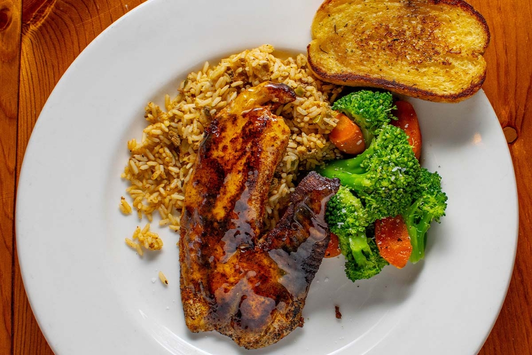 Fresh blackened tilapia with Cajun rice & steamed broccoli carrot medley