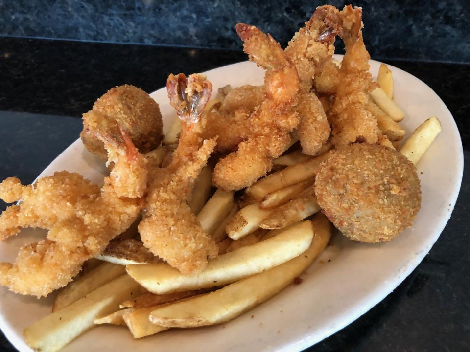 (3) Fried Shrimp, (1) Mississippi farm-raised fried catfish, (2) boudin balls & (2) hush puppies