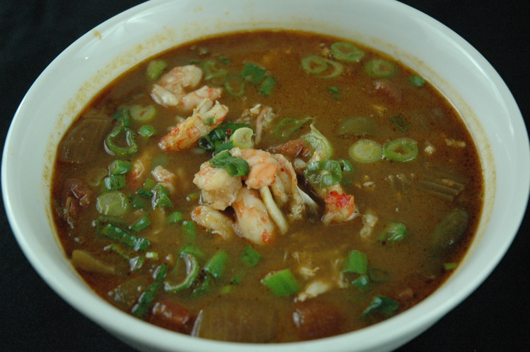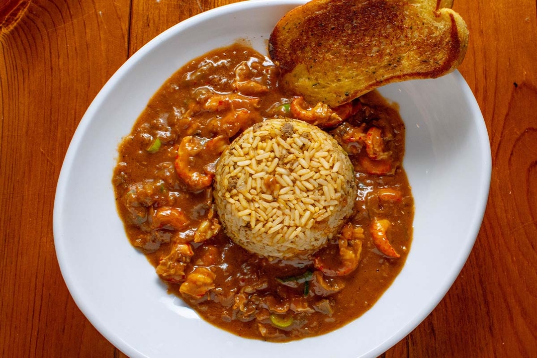 New Orleans Seafood Gumbo: Our top selection of gulf shrimp, crabmeat and Louisiana crawfish tails sauteed in the trinity, butter and a creole roux. Served with fresh garlic bread with your choice of steamed or Cajun rice.