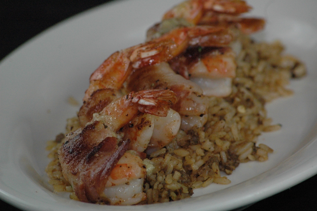 Hunter style shrimp: 5-Jumbo gulf shrimp wrapped in applewood bacon and served with house made remoulade and horseradish cocktail sauce.