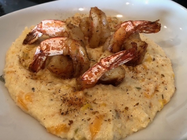Creole shrimp and cheddar grits: 5-Sauteed jumbo gulf shrimp served atop a creamy southern style cheddar grits with roasted buttered corn.