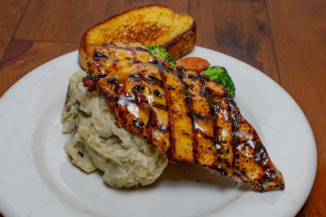 Marinated grilled chicken breast with mashed potatoes and broccoli and carrot medley