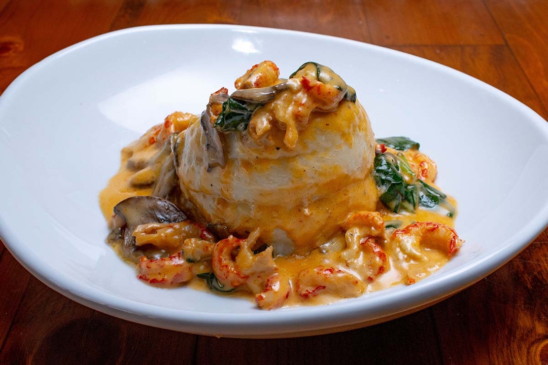 Baked Mississippi Farm-raised fresh catfish stuffed with homemade boudin topped with crawfish, spinach & mushrooms in a homemade cream sauce