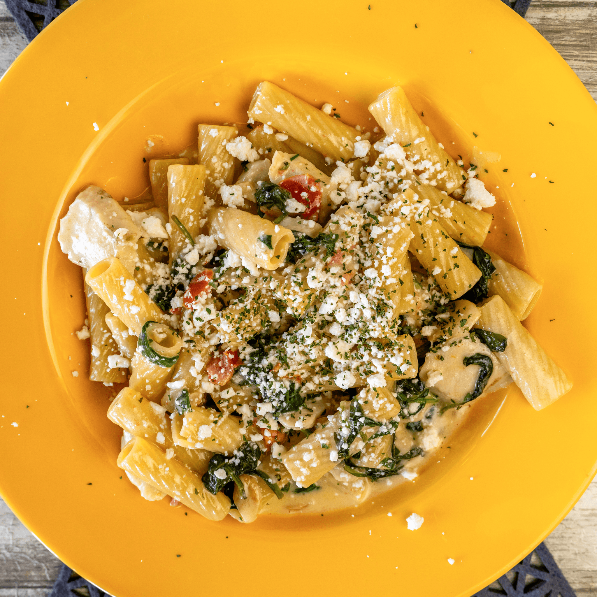 House favorite! Sliced grilled chicken, fresh garlic, chopped tomatoes, spinach, and basil served in a creamy garlic and oil sauce served with ziti pasta and topped with feta cheese.
