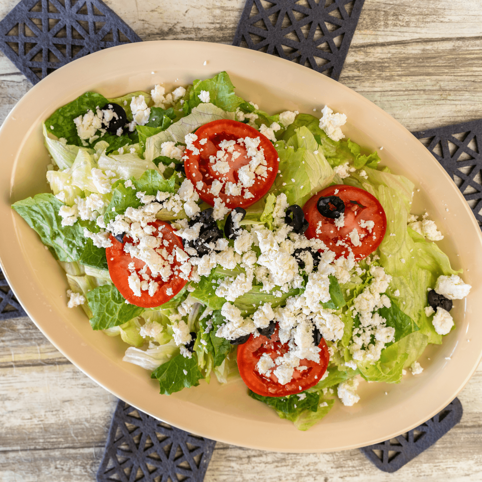 Romaine and iceberg mix topped with tomatoes, black olives, feta cheese and our house creamy Italian vinaigrette on the side. Served with garlic bread. Serves 2.