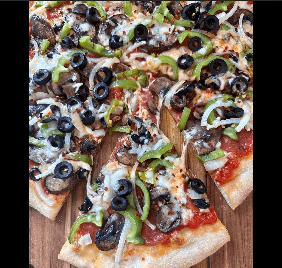Topped with mushrooms, onions, bell peppers, black olives, and tomatoes.