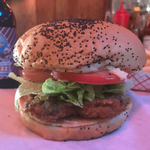 Our fried tenders with mayonnaise, lettuce, and tomato on a poppyseed bun.