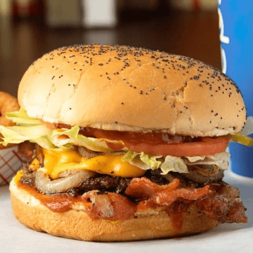 Two 1/3 lb patties complemented with crispy bacon, American cheese, mayo, mustard, lettuce, tomato, pickle and onion on our poppy seed bun.