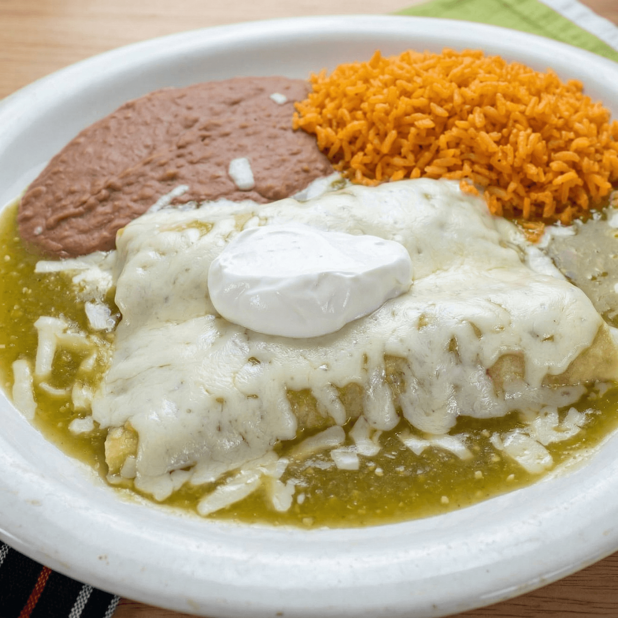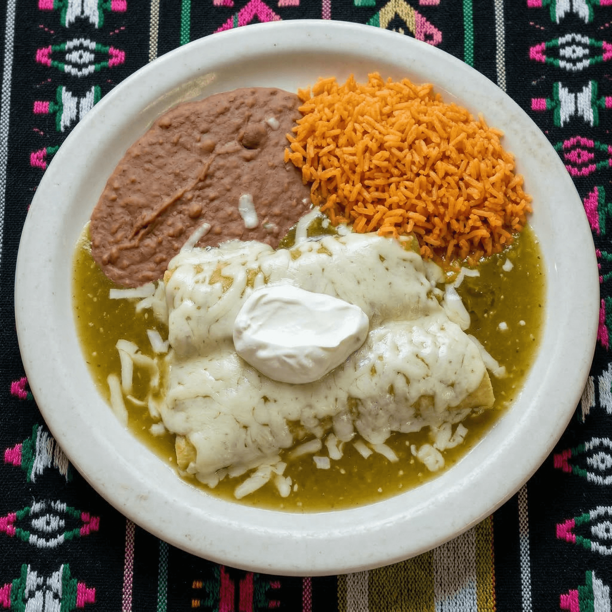 2 cheese enchiladas covered with tomatillo sauce topped with sour cream and white cheese served with rice and refried beans