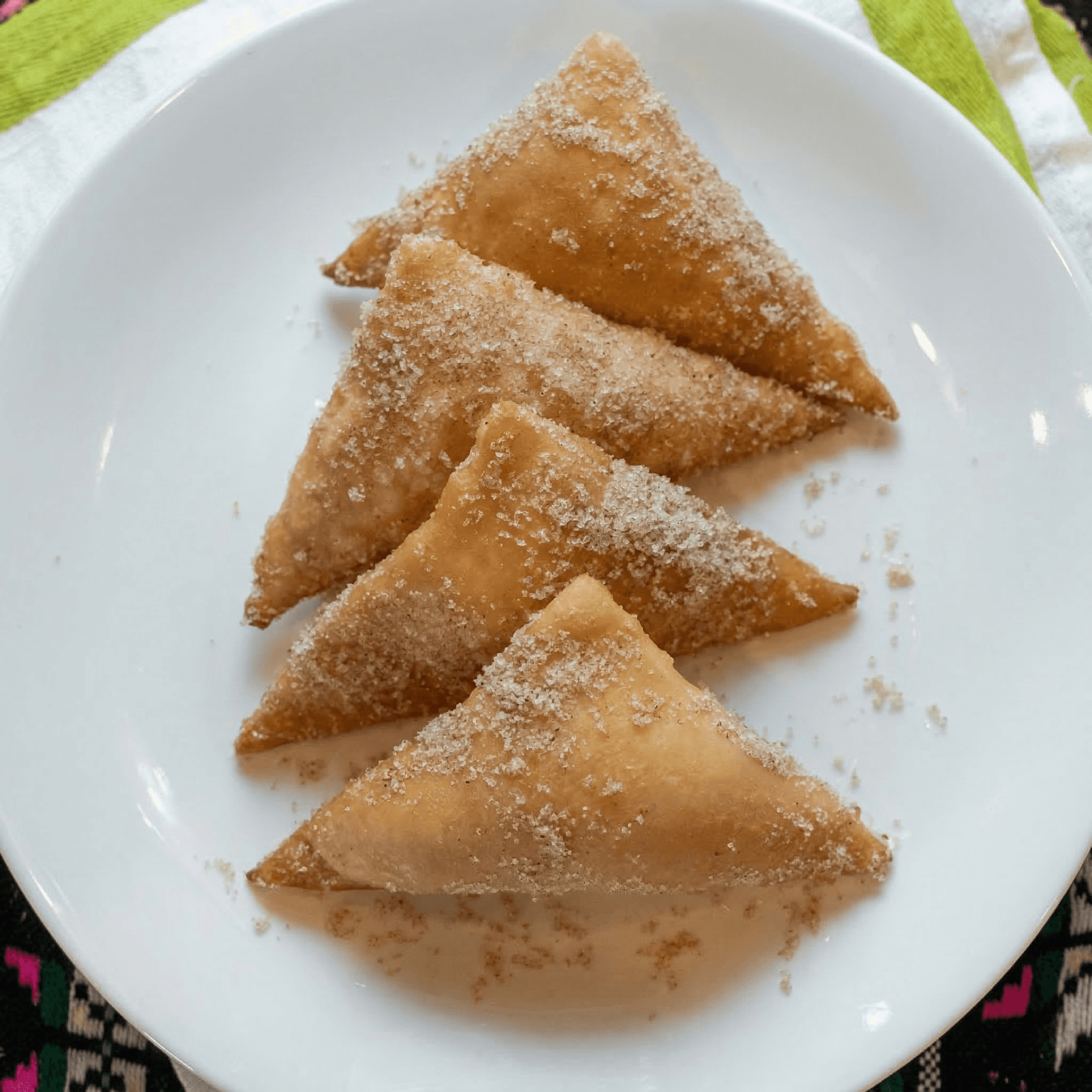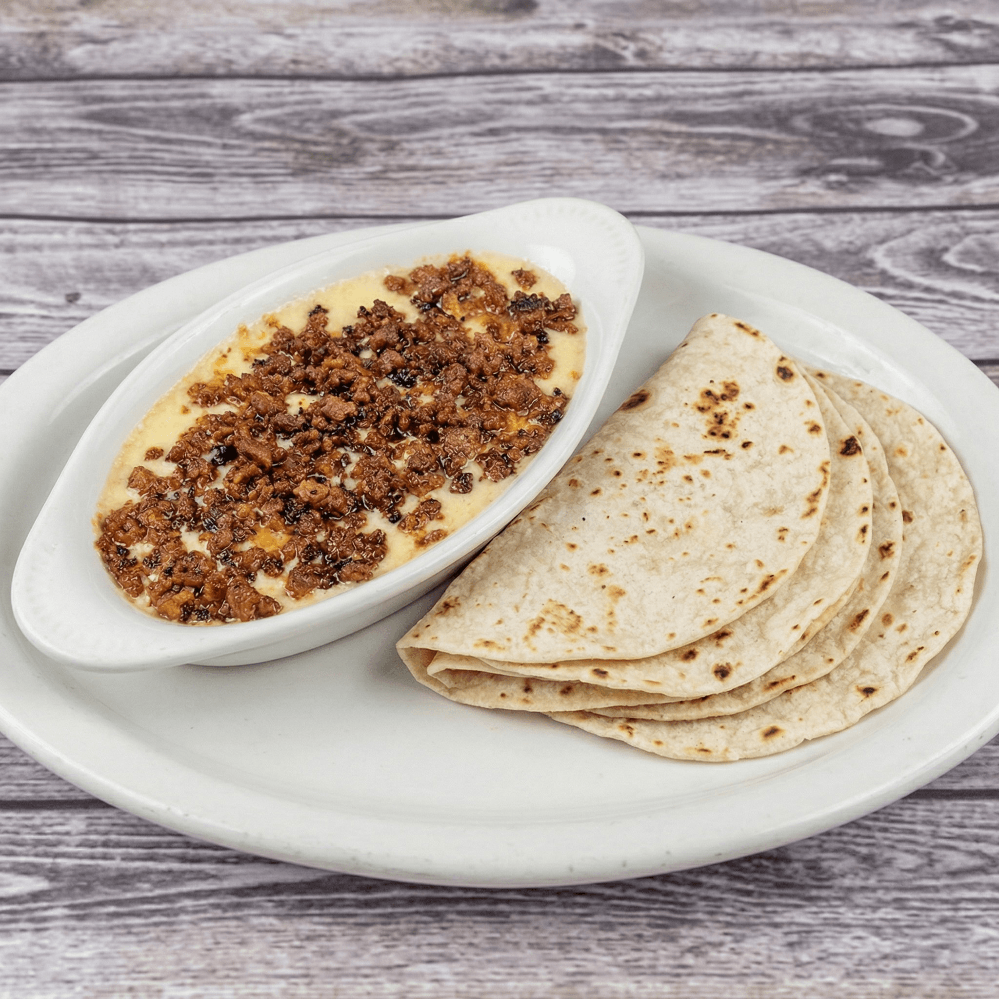 3 deep-fried corn tortillas filled with ground beef, potatoes & cheese served with sour cream