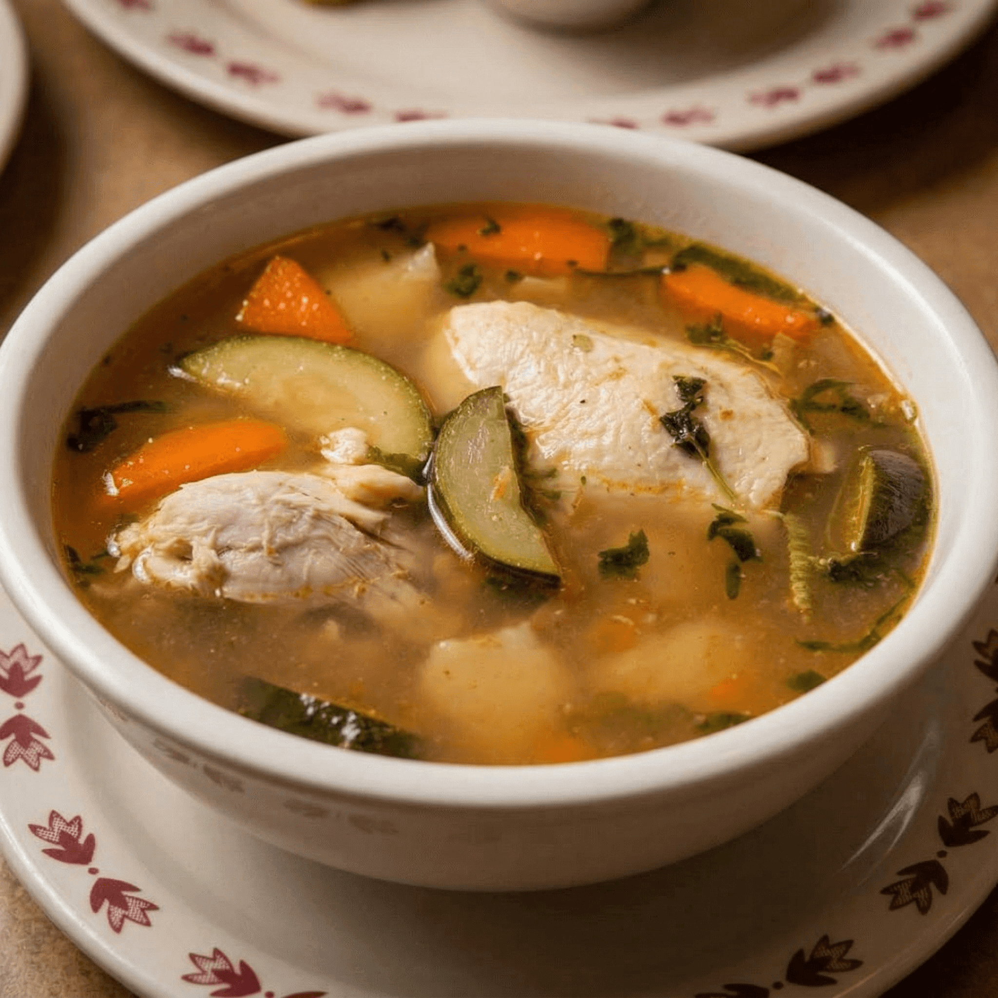 Our chicken soup with carrots, potatoes, and squash served with rice and tortillas