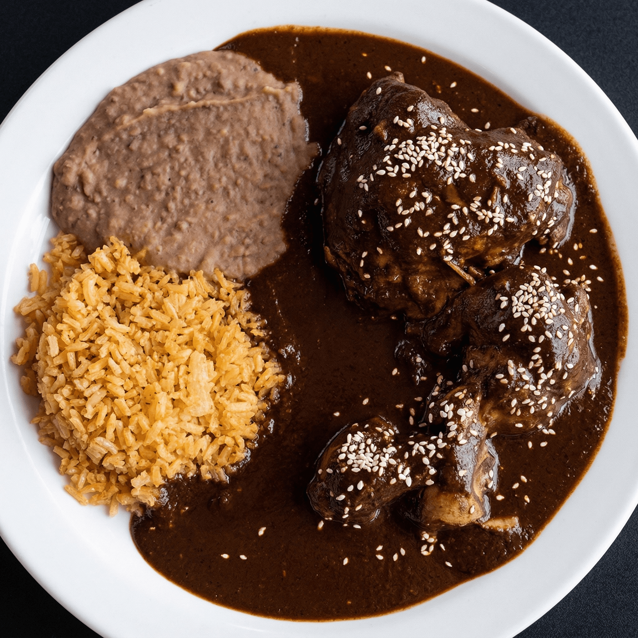 Leg and thigh covered in rich mole poblano served with rice and refried beans