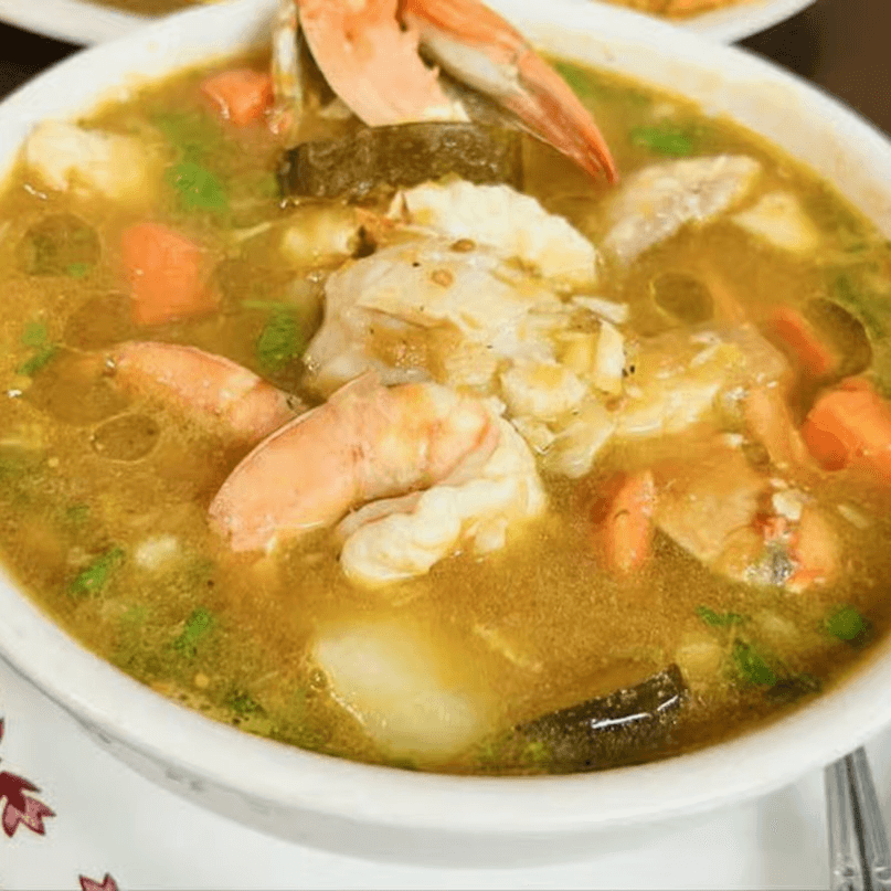 Tilapia fish fillet, shrimp, crab, and vegetables served with rice and tortillas