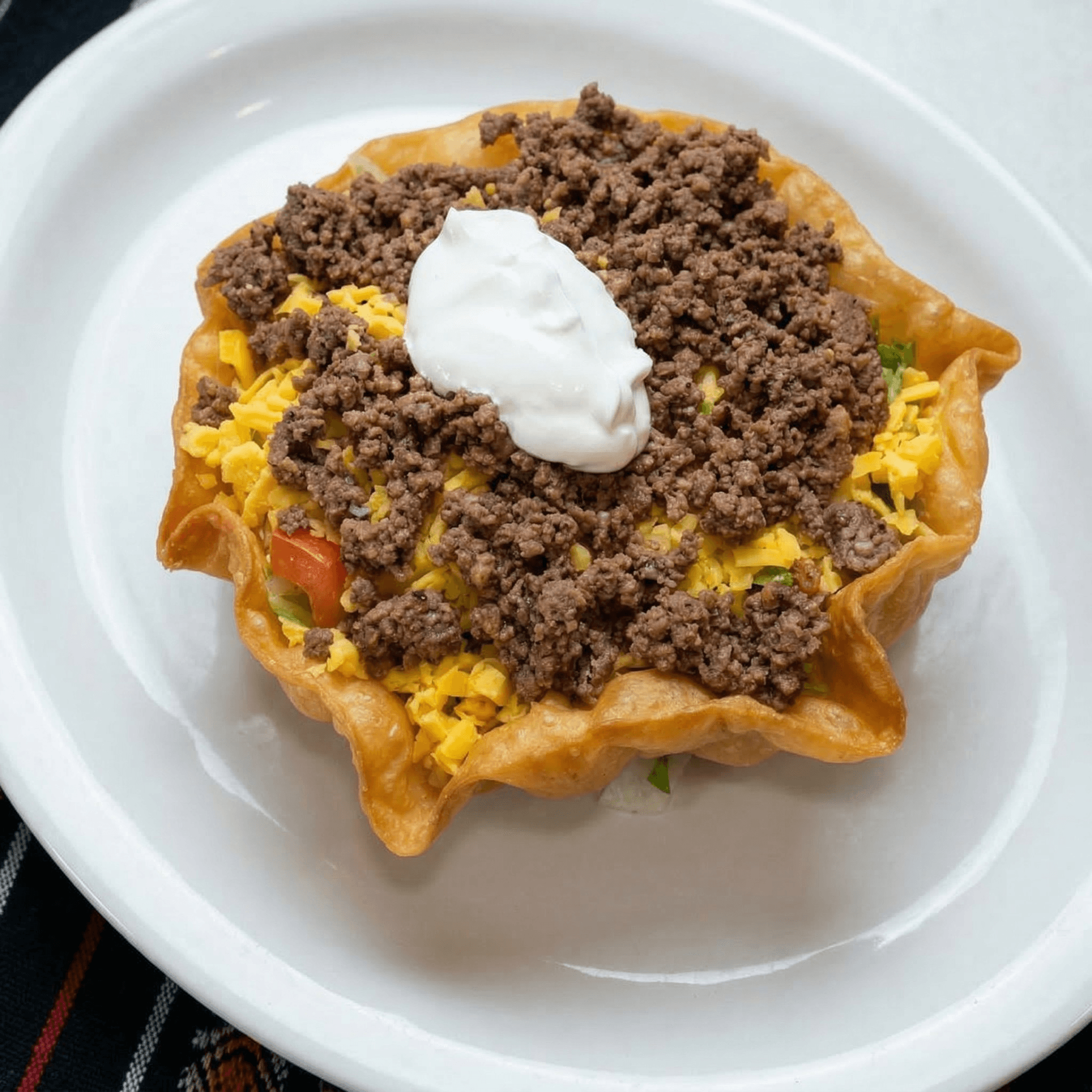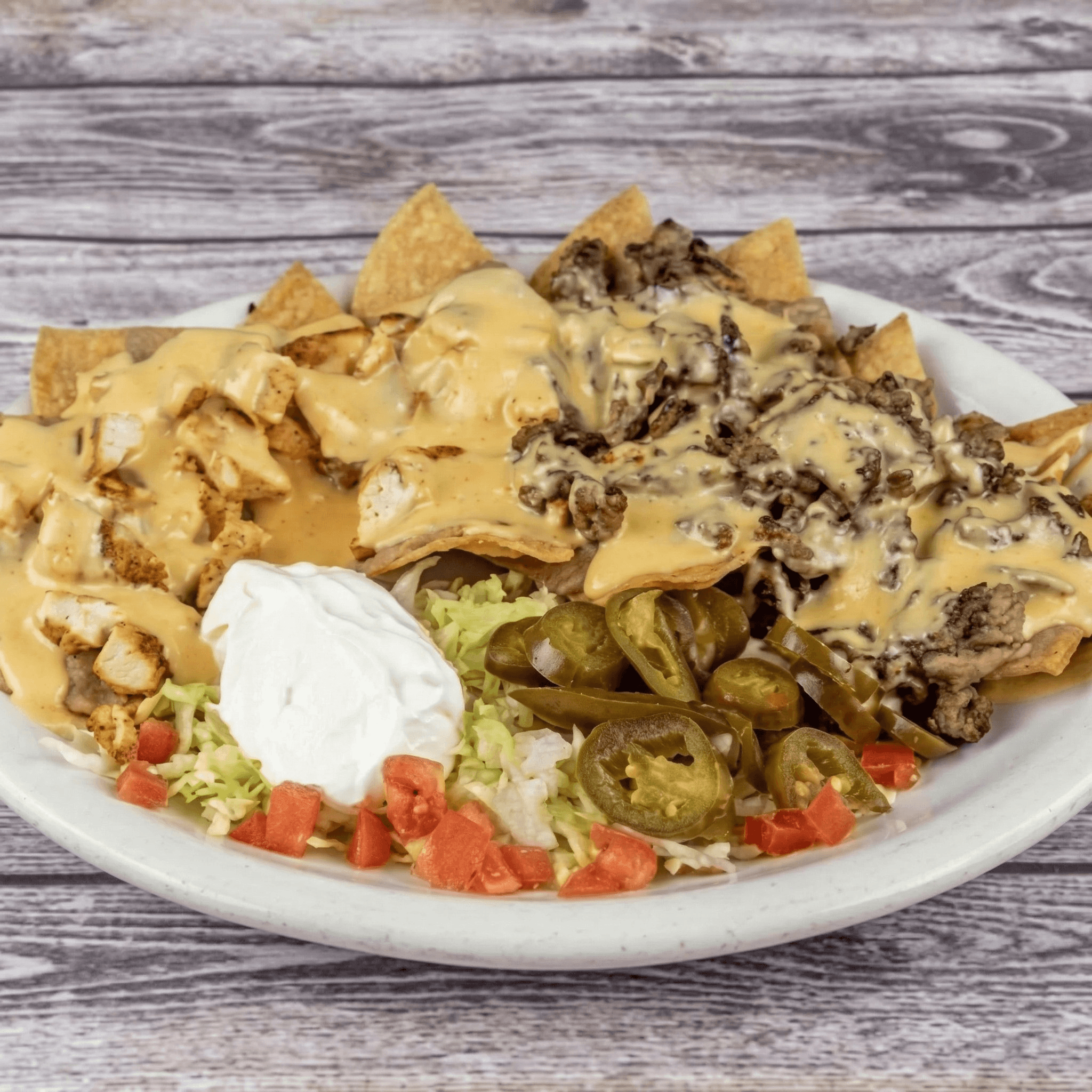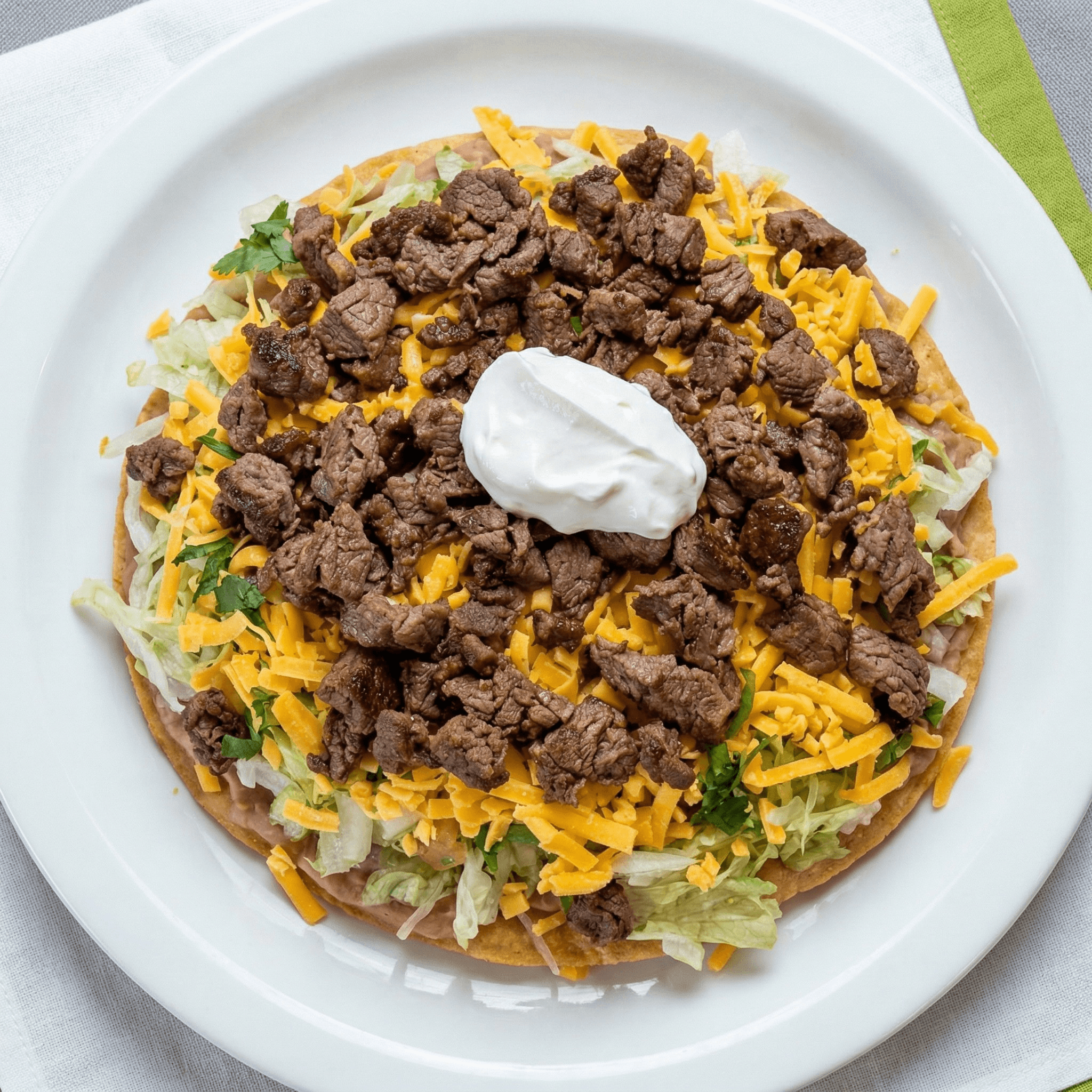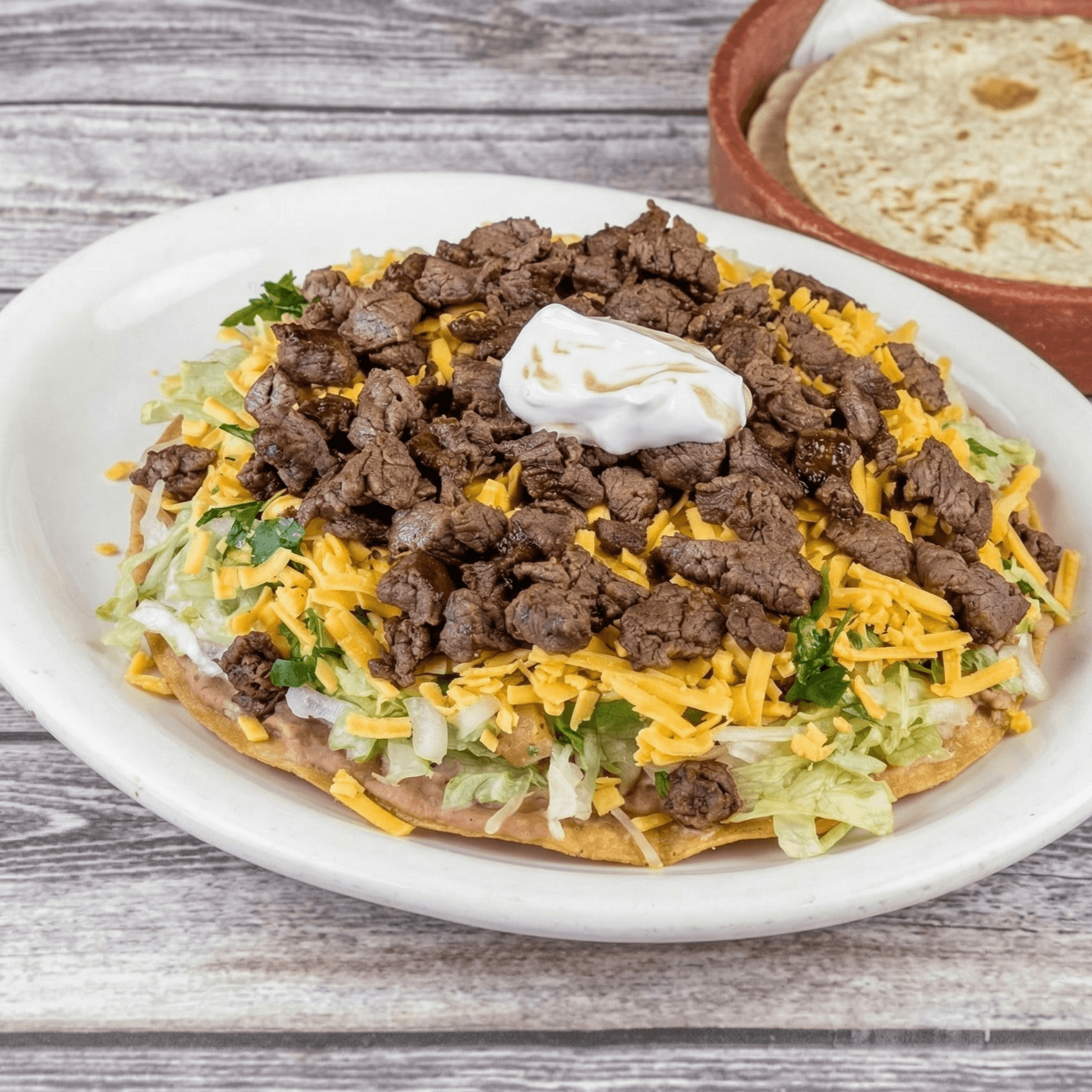 Giant crispy flour tortilla topped with refried beans, choice of meat, shredded cheese, lettuce, pico de gallo, and sour cream