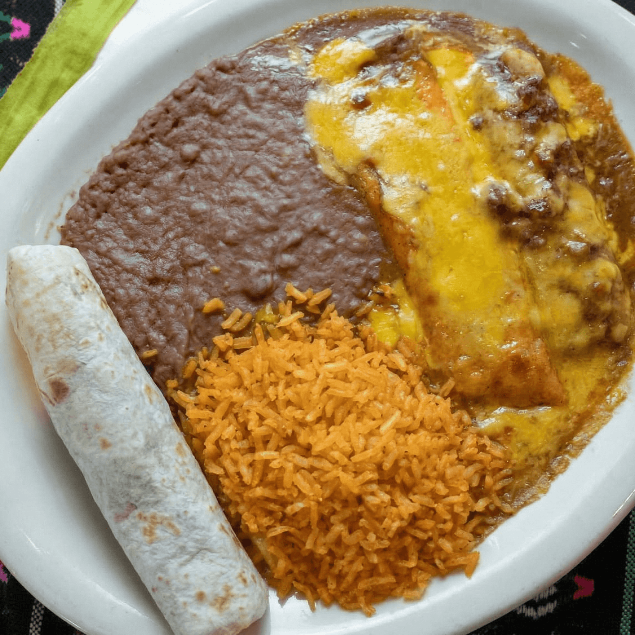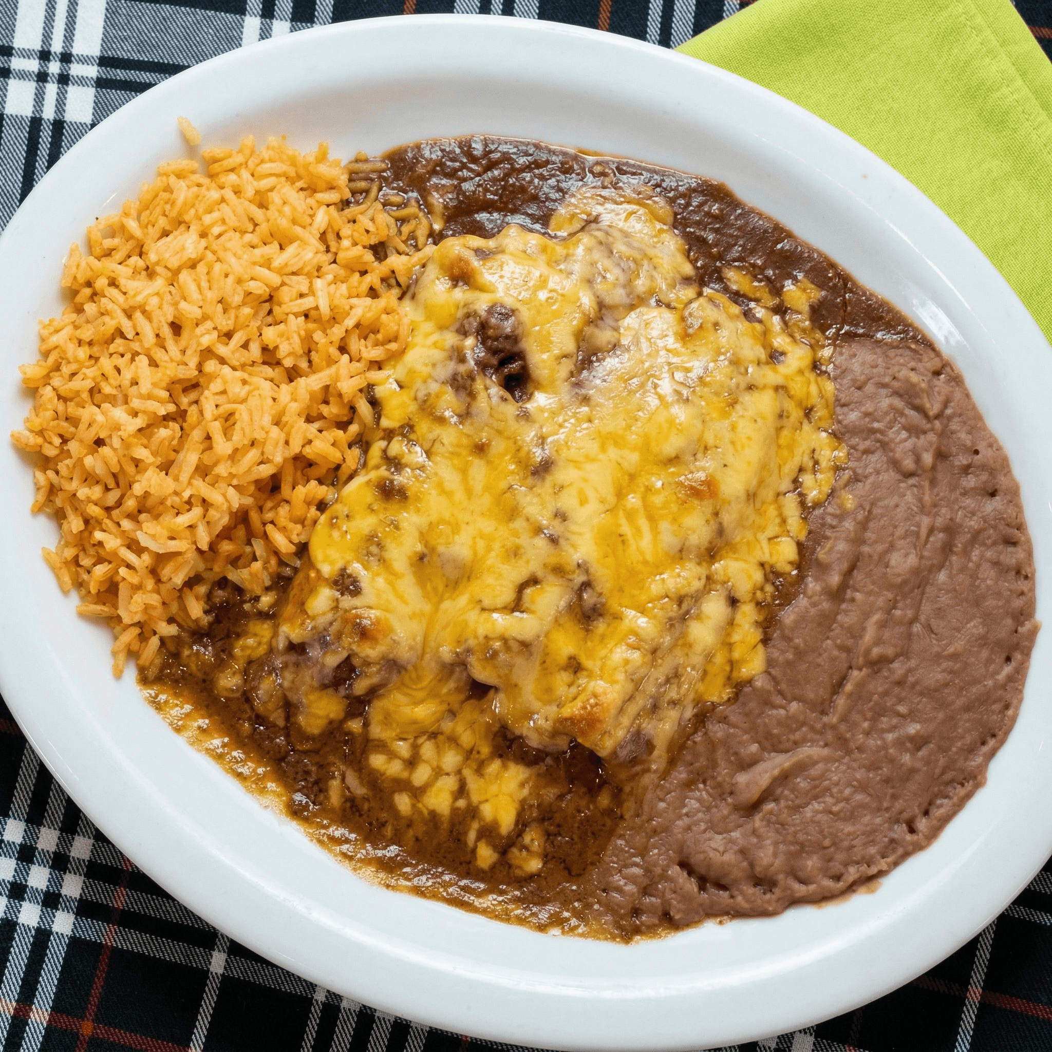 2 beef or chicken enchiladas covered with gravy and topped with cheese served with rice and refried beans
