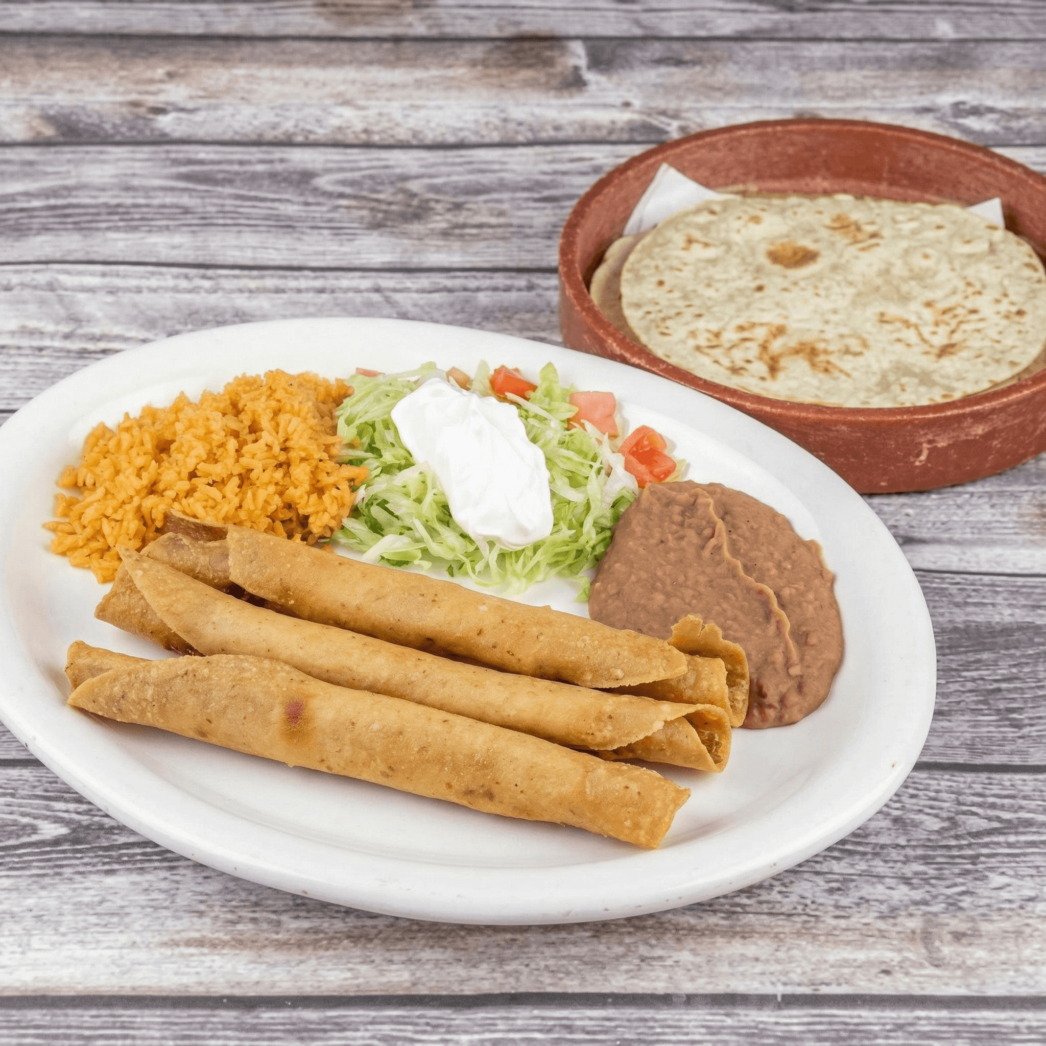 3 shredded chicken flautas served with rice, refried beans, and sour cream