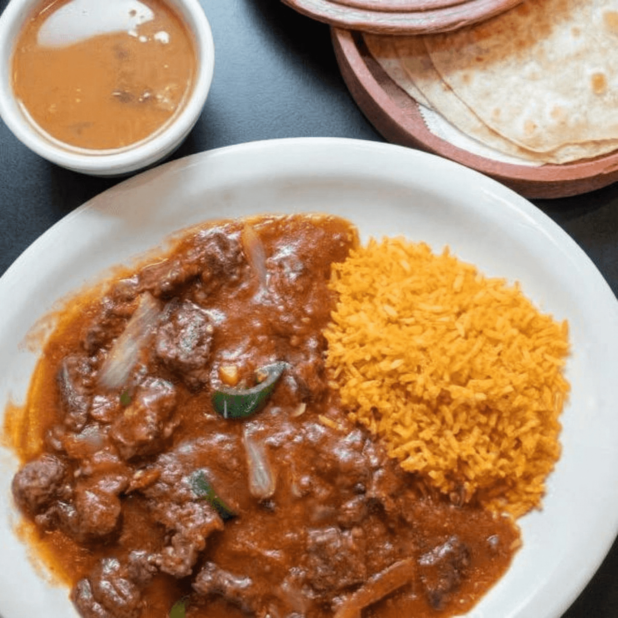 Beef chunks cooked in a stew served with rice, refried beans, and tortillas