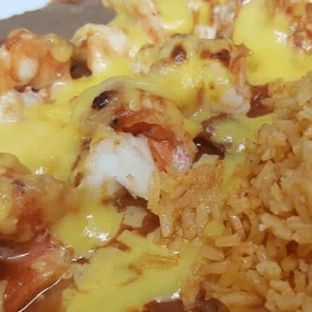 2 shrimp enchiladas covered with ranchera sauce and topped with cheese served with rice and refried beans