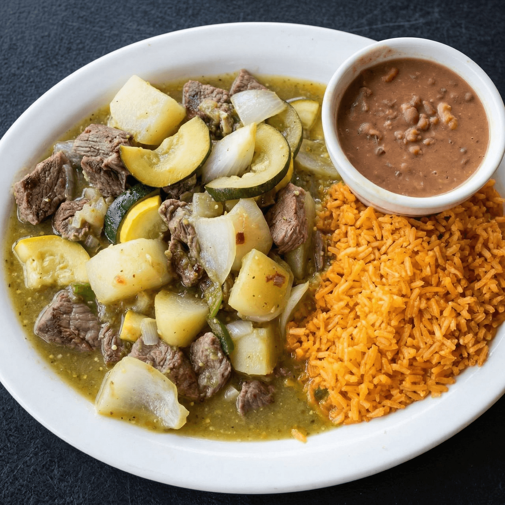 Fajita strips in our tomatillo sauce with potatoes and squash served with rice, charros, and tortillas