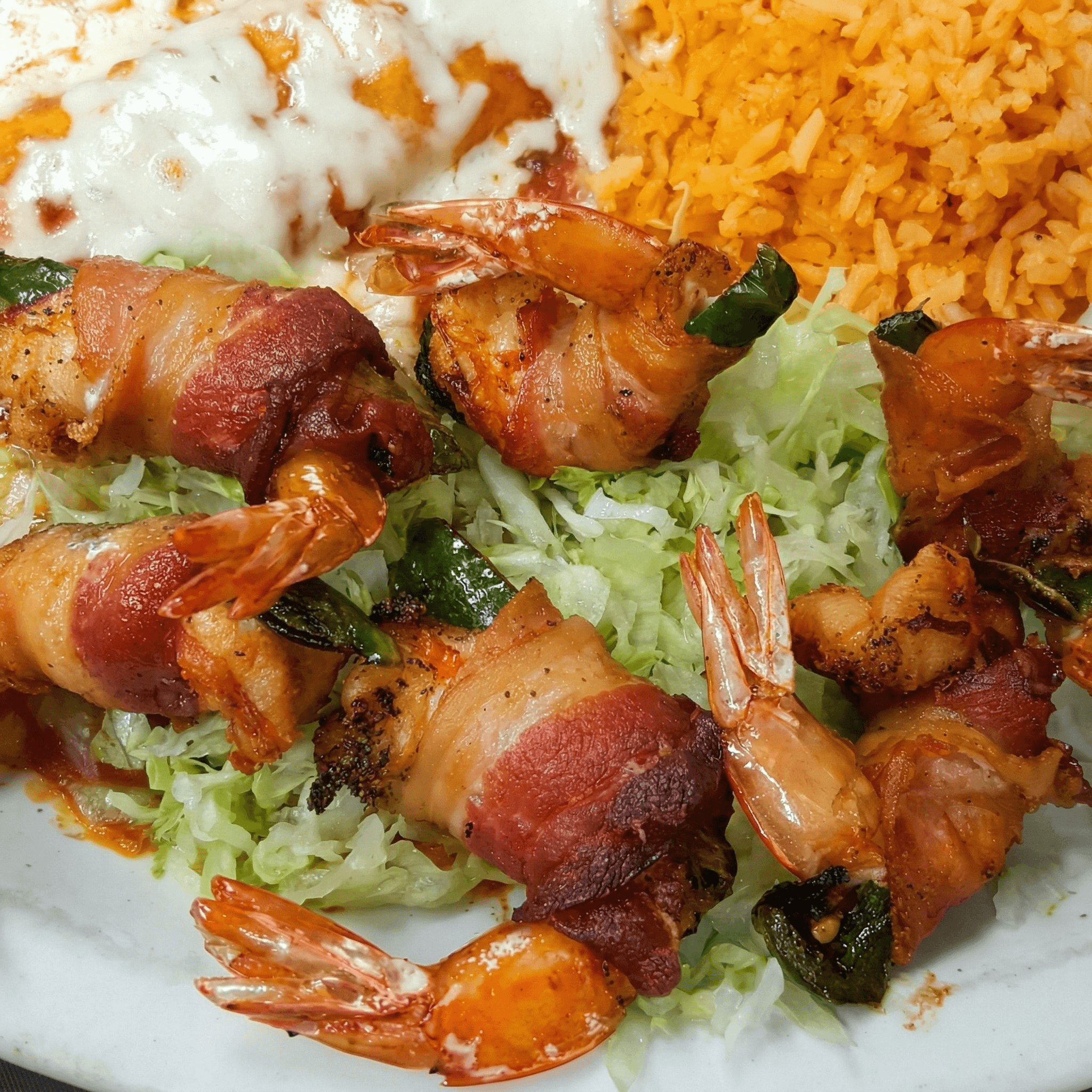 8 shrimp wrapped in bacon and stuffed with jalapeños served with rice, charros beans, and tortillas