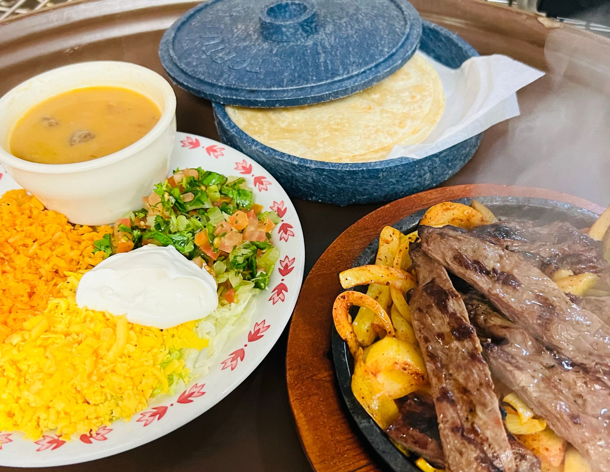 Fajita skirt steak on a sizzling plate served with pico de gallo, rice, charros, and tortillas