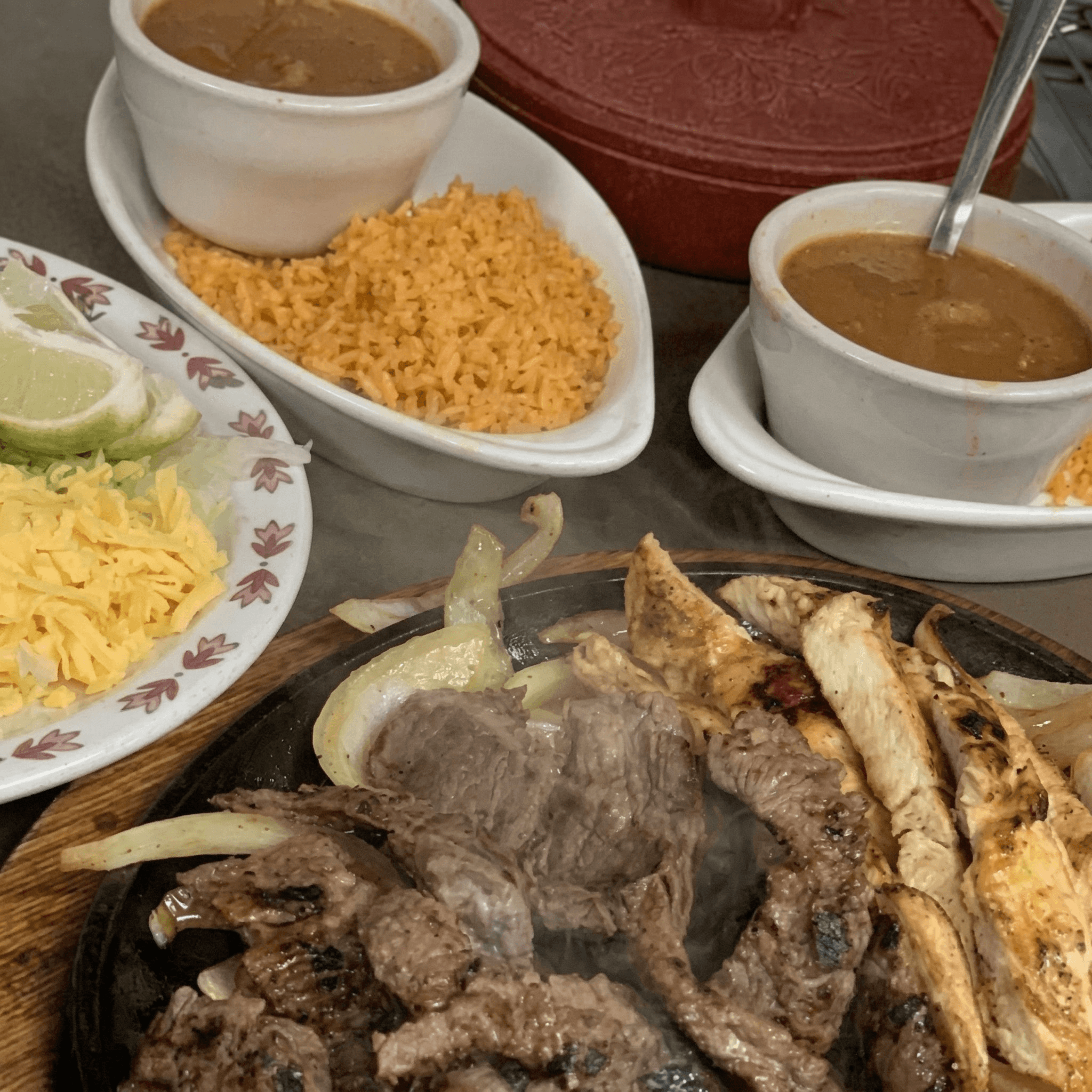 Fajita strips in our "Salsa Mexicana" with onions, tomatoes, and jalapeños served with rice, charros, and tortillas
