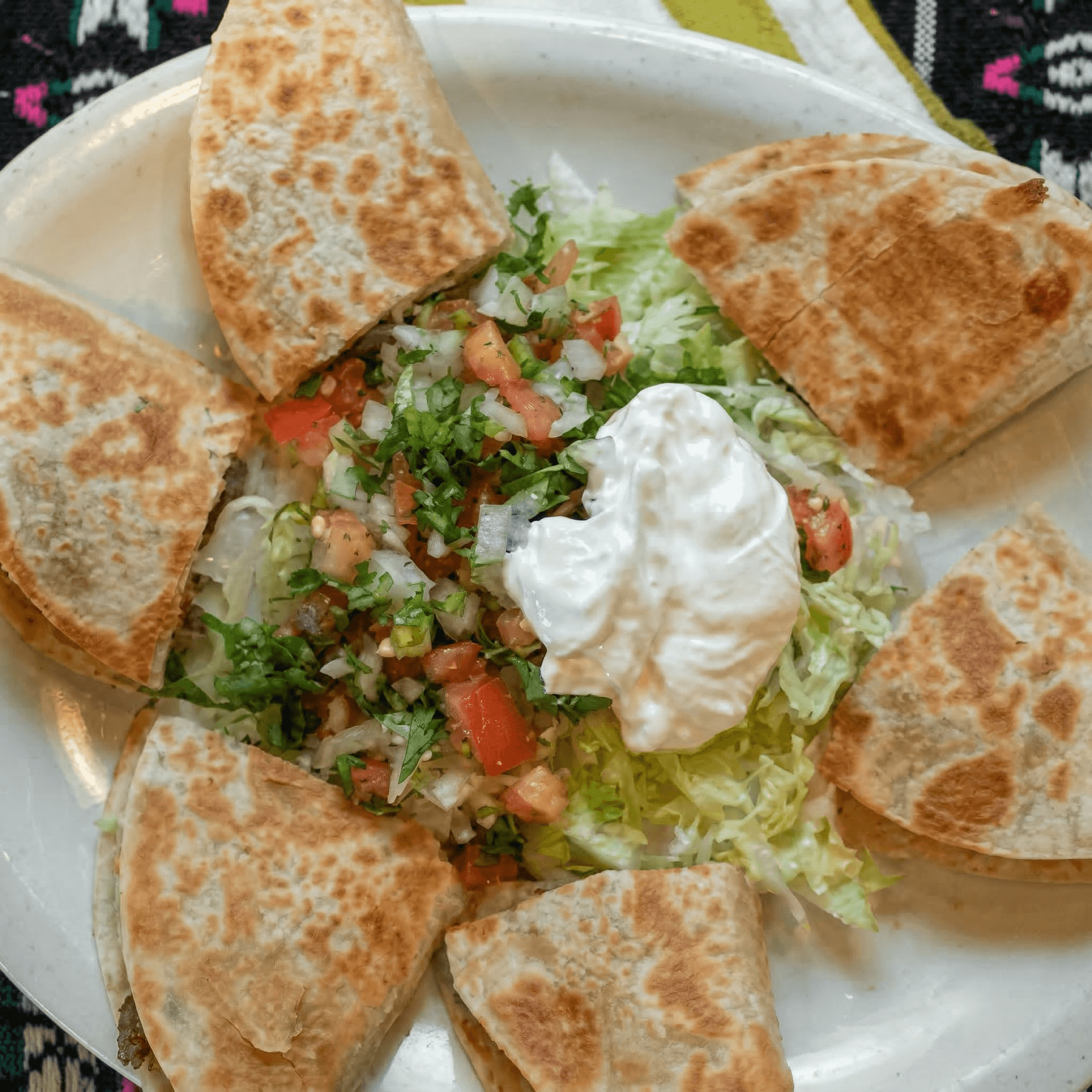 3 quesadillas with vegetables and white cheese served with pico de gallo and sour cream