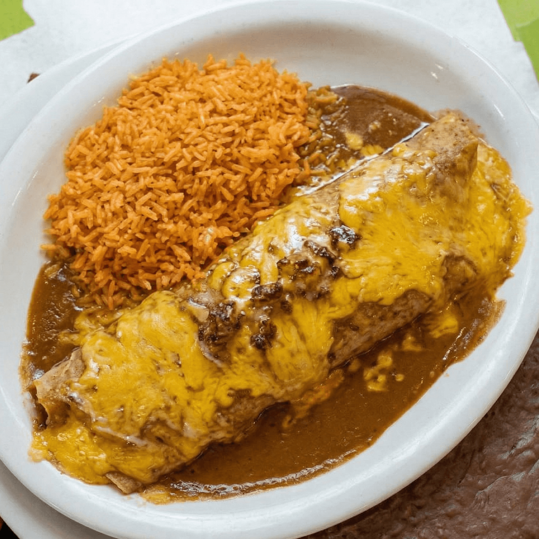 Large flour tortilla filled with beef or chicken fajita and refried beans covered with queso dip served with rice