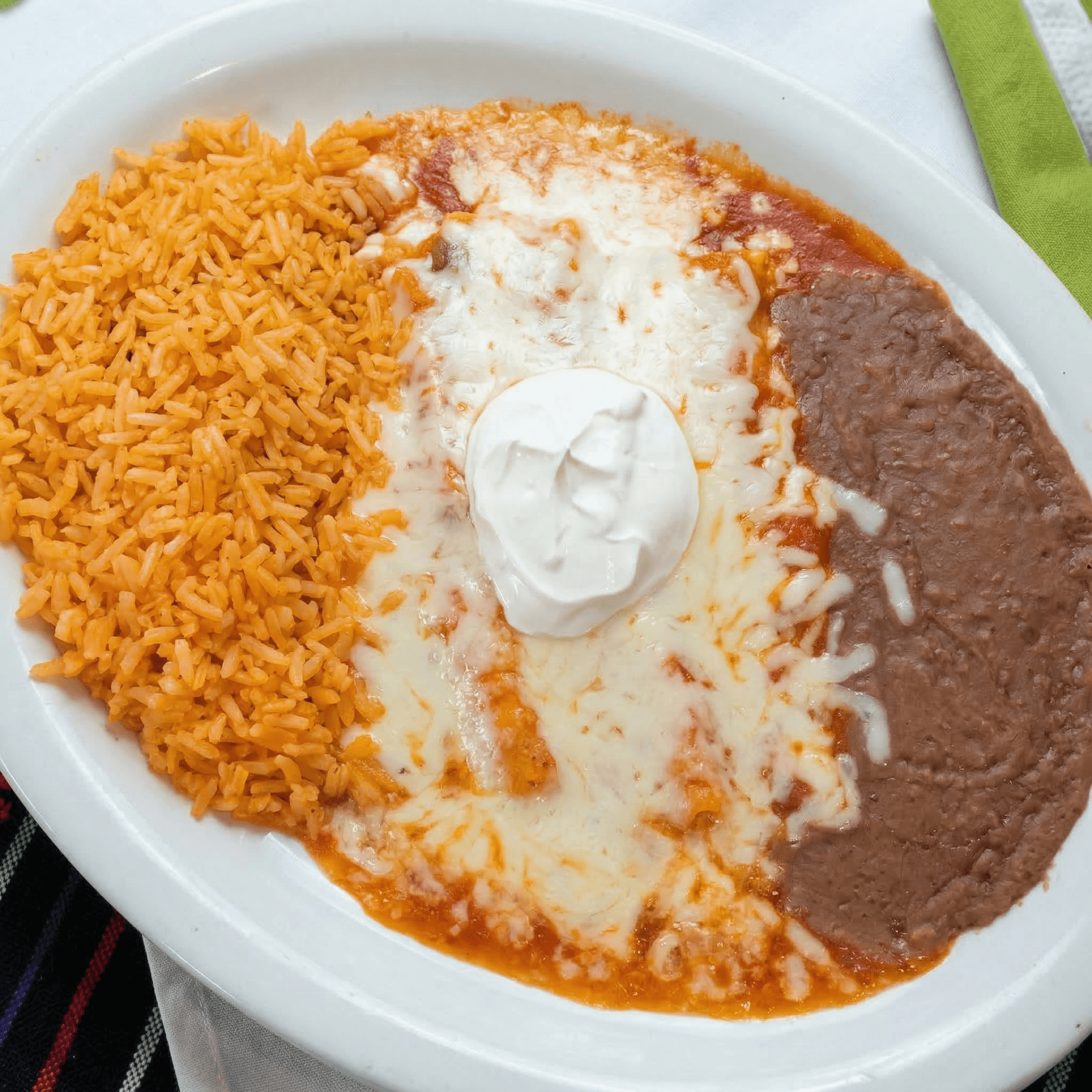 3 cheese enchiladas covered with ranchera sauce topped with sour cream and white cheese served with rice and refried beans