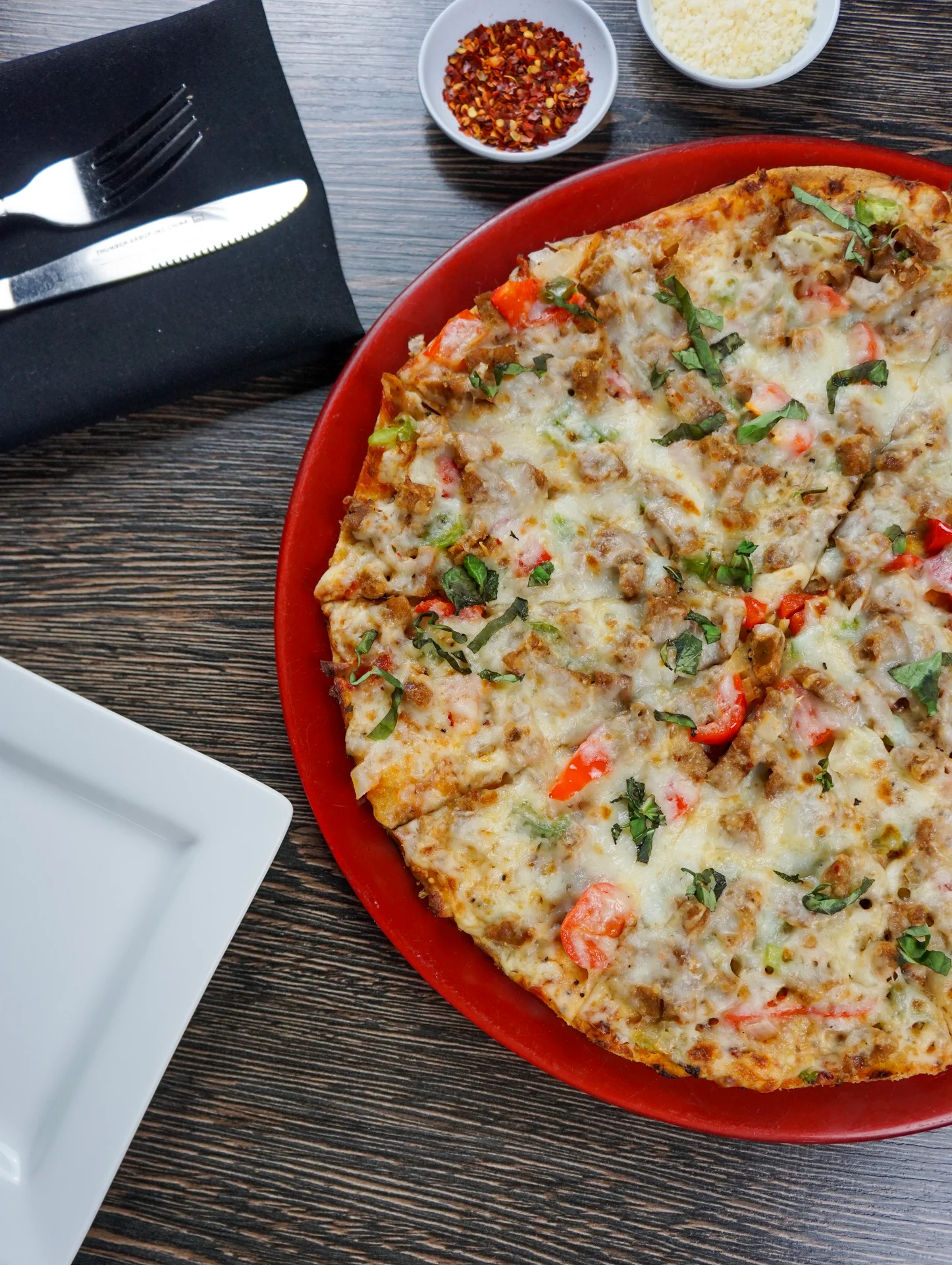 Thin & Crispy White Tortilla Crust, Marinara Base, Hot Italian Sausage Topped w/Sweet Caramelized Onion & Chopped Red & Green Pepper
