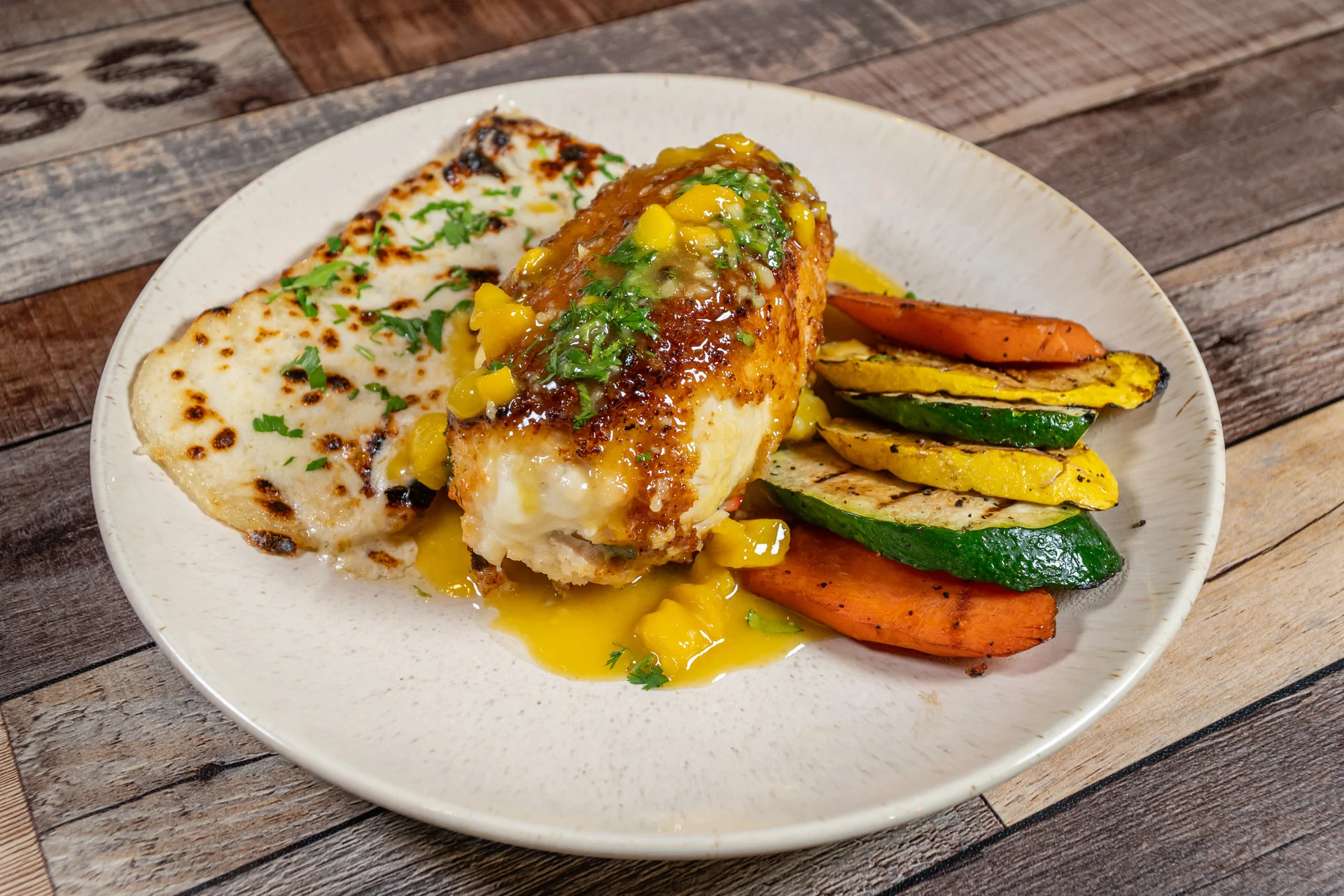Panko Crusted Stuffed Breast Topped With Mango Butter Sauce Served w / Creamy Scalloped Potatoes & Grilled Vegetables