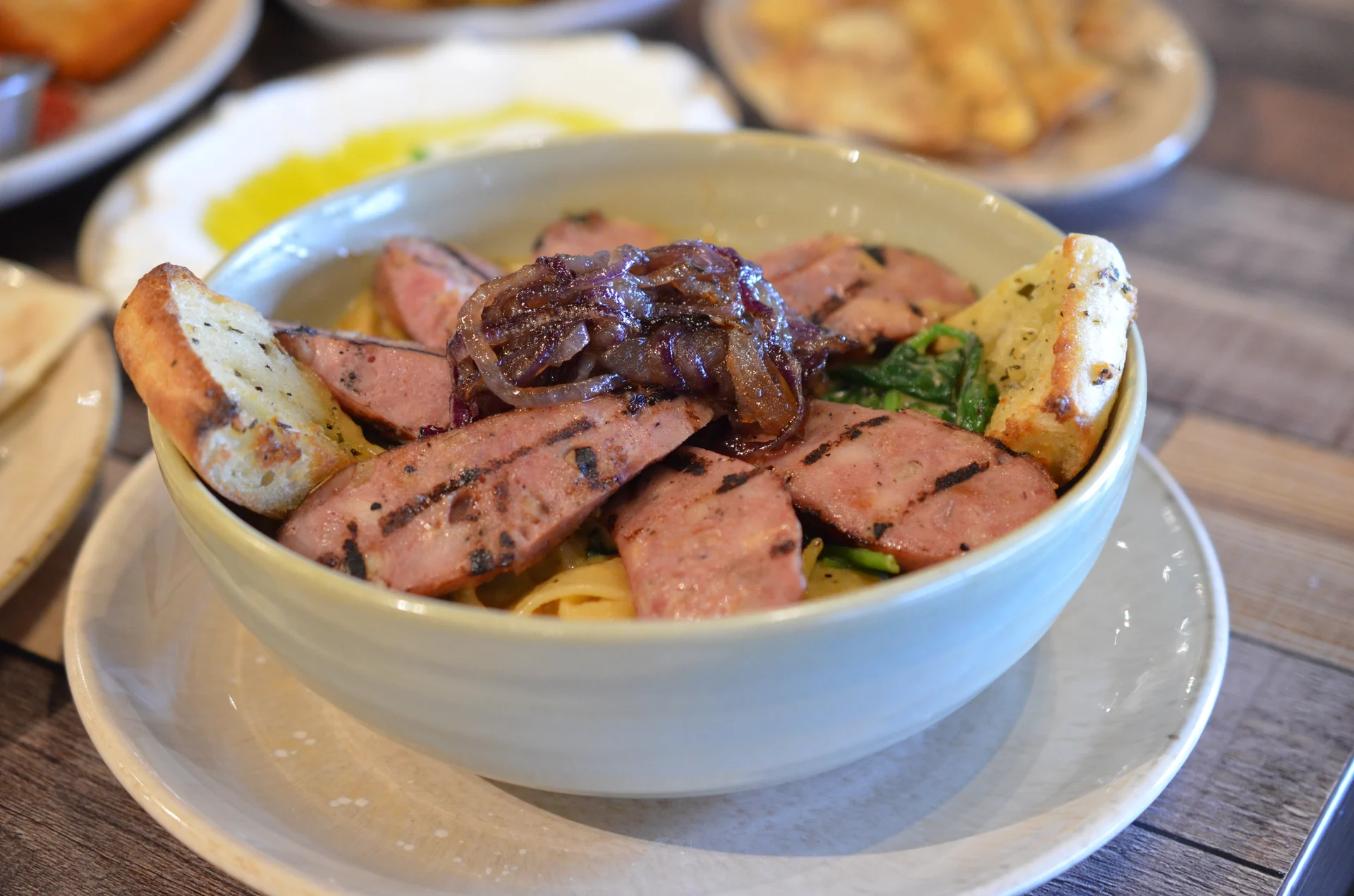 Fettuccini Pasta in a Spicy Chipotle Black Pepper Sauce, Baby Spinach & Caramelized Onion
