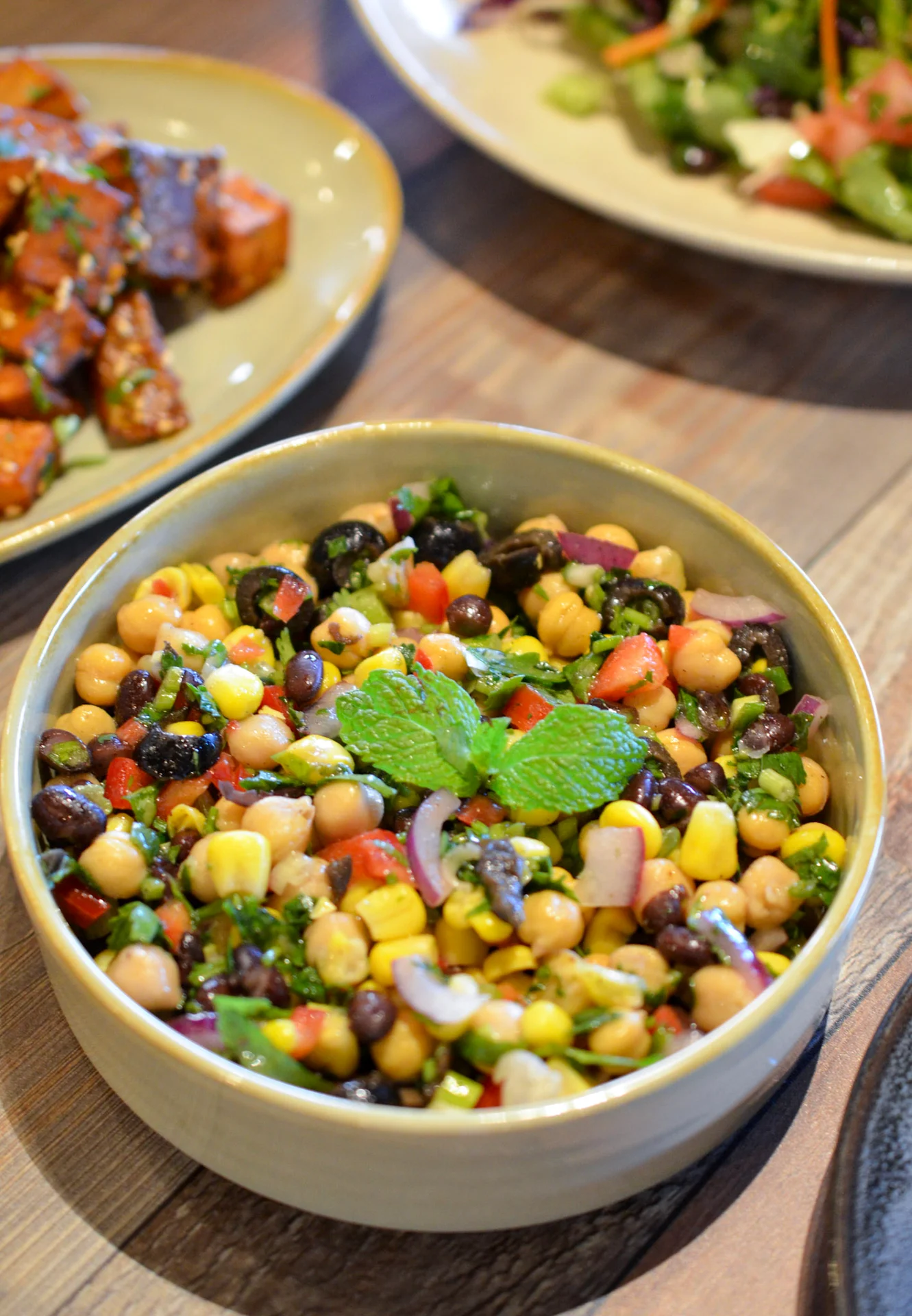 Chickpeas, Red Onion, Corn, Black Beans, Olives, Cilantro, Parsley, Olive Oil, Lime