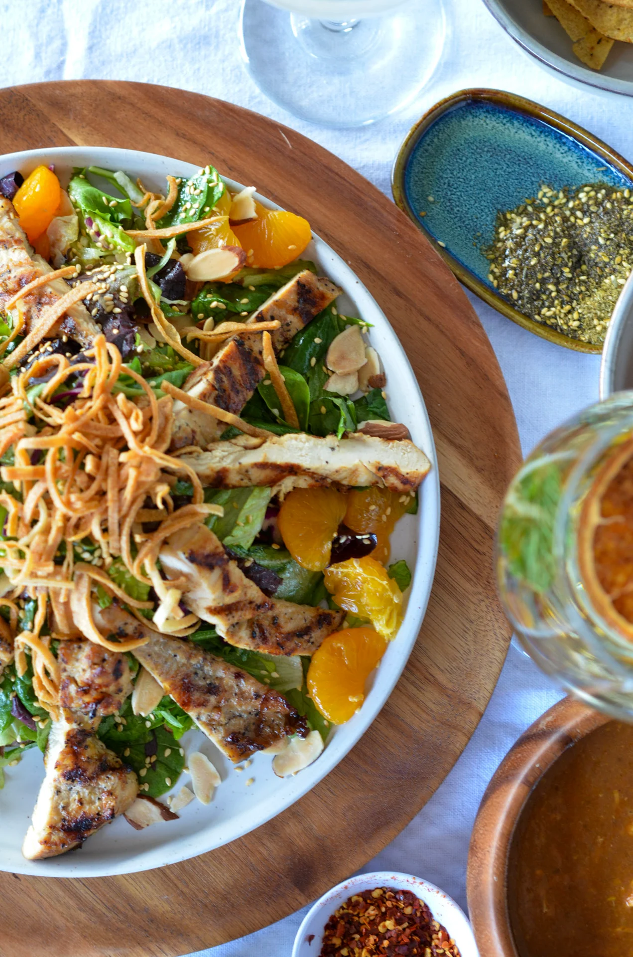 Mixed Greens & Mandarin Oranges Tossed In A Tangy Sweet Sesame Dressing Topped w /Crispy Strips, Fresh Cilantro & Toasted Almonds