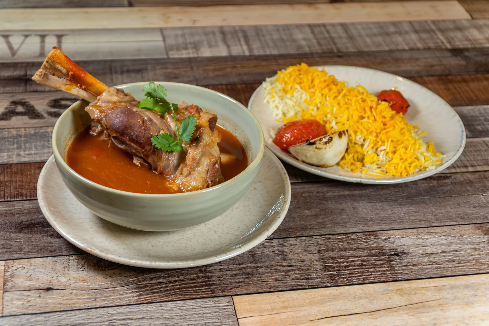 Single Lamb Shank Slowly Stewed In A Mediterranean Broth Served w/Saffron Basmati Rice & Grilled Tomato and Onion