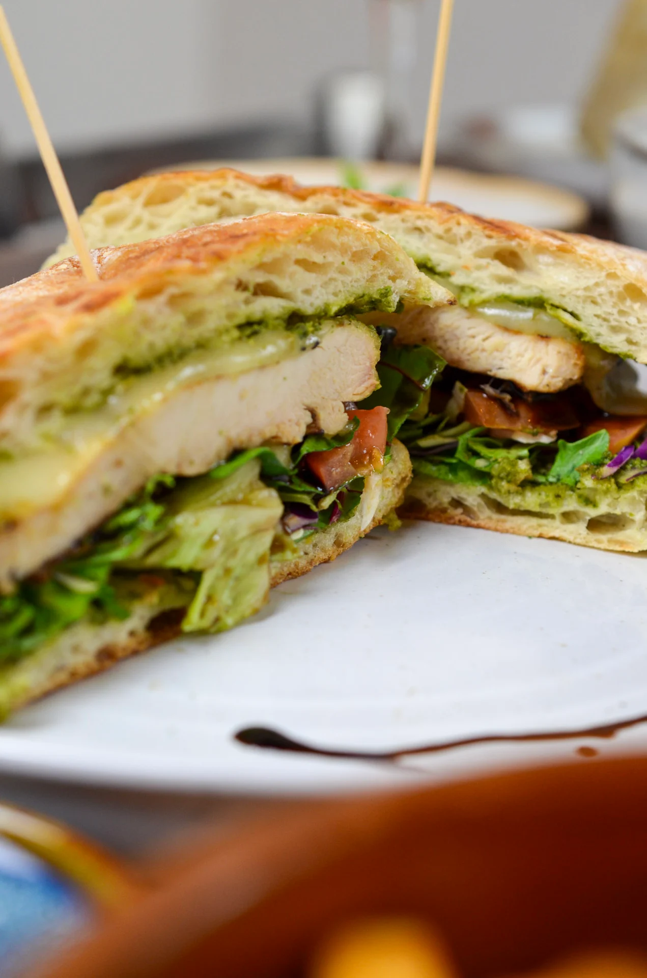 Grilled Chicken Breast, Spring Mix, Sliced Tomatoes, Balsamic Glaze, Pesto, & Melted Pepper Jack Cheese on Toasted Ciabatta Bread