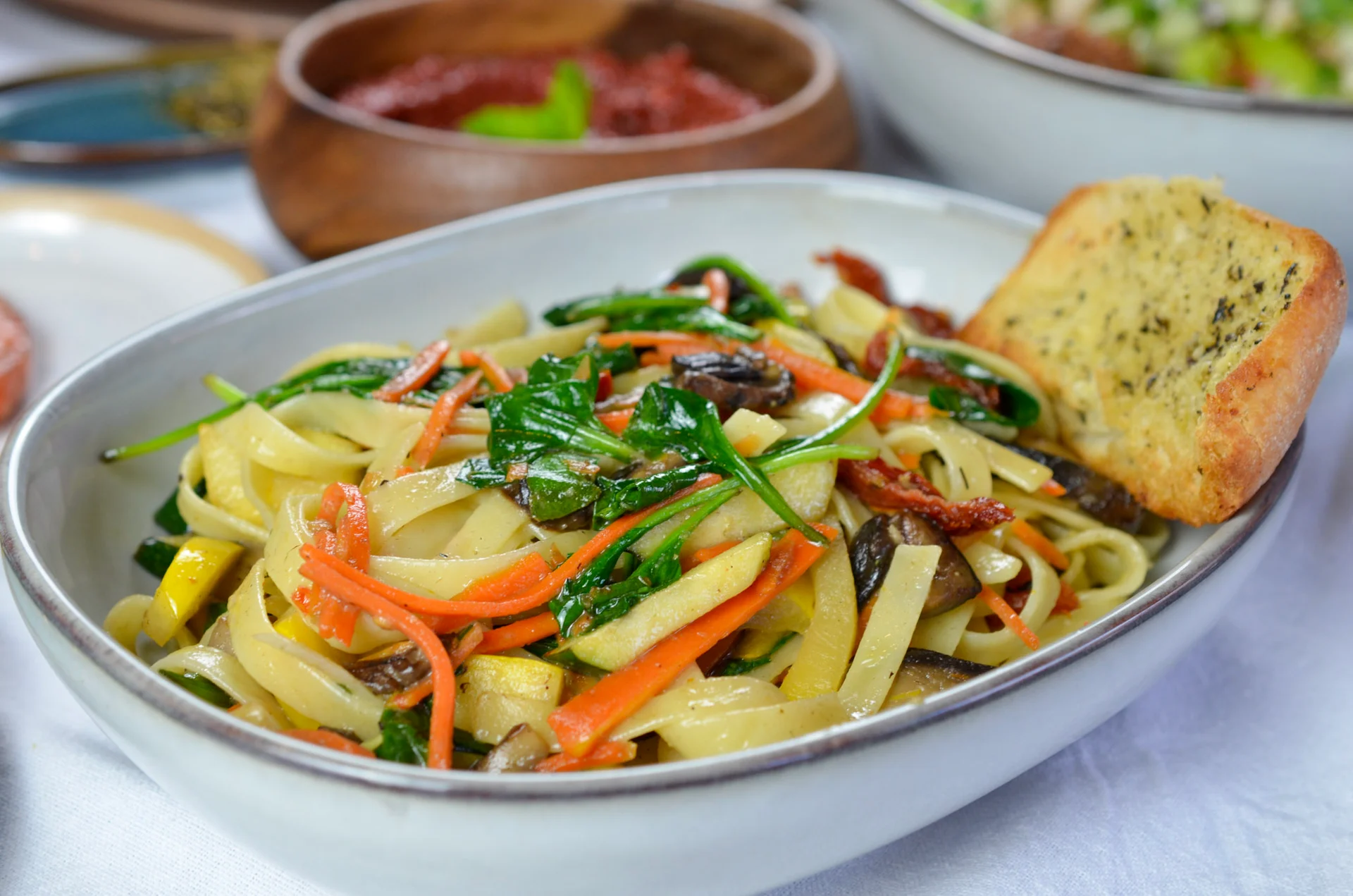 Fettuccini Pasta, Zucchini, Yellow Squash, Shredded Carrots, Mushrooms, Sun-Dried Tomato & Baby Spinach Tossed In A Garlic Lemon Butter Sauce
