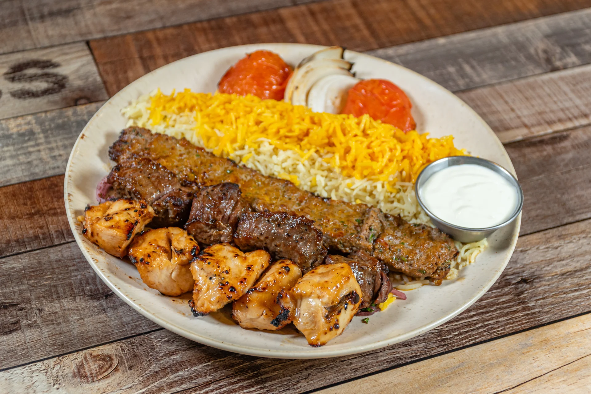 One Skewer Each Of Shish Kabob, Shish Tawook & Kufta Kabob Served w /Sliced Onion, Sumac, Creamy Garlic Sauce, Saffron Basmati Rice & Grilled Tomato And Onion