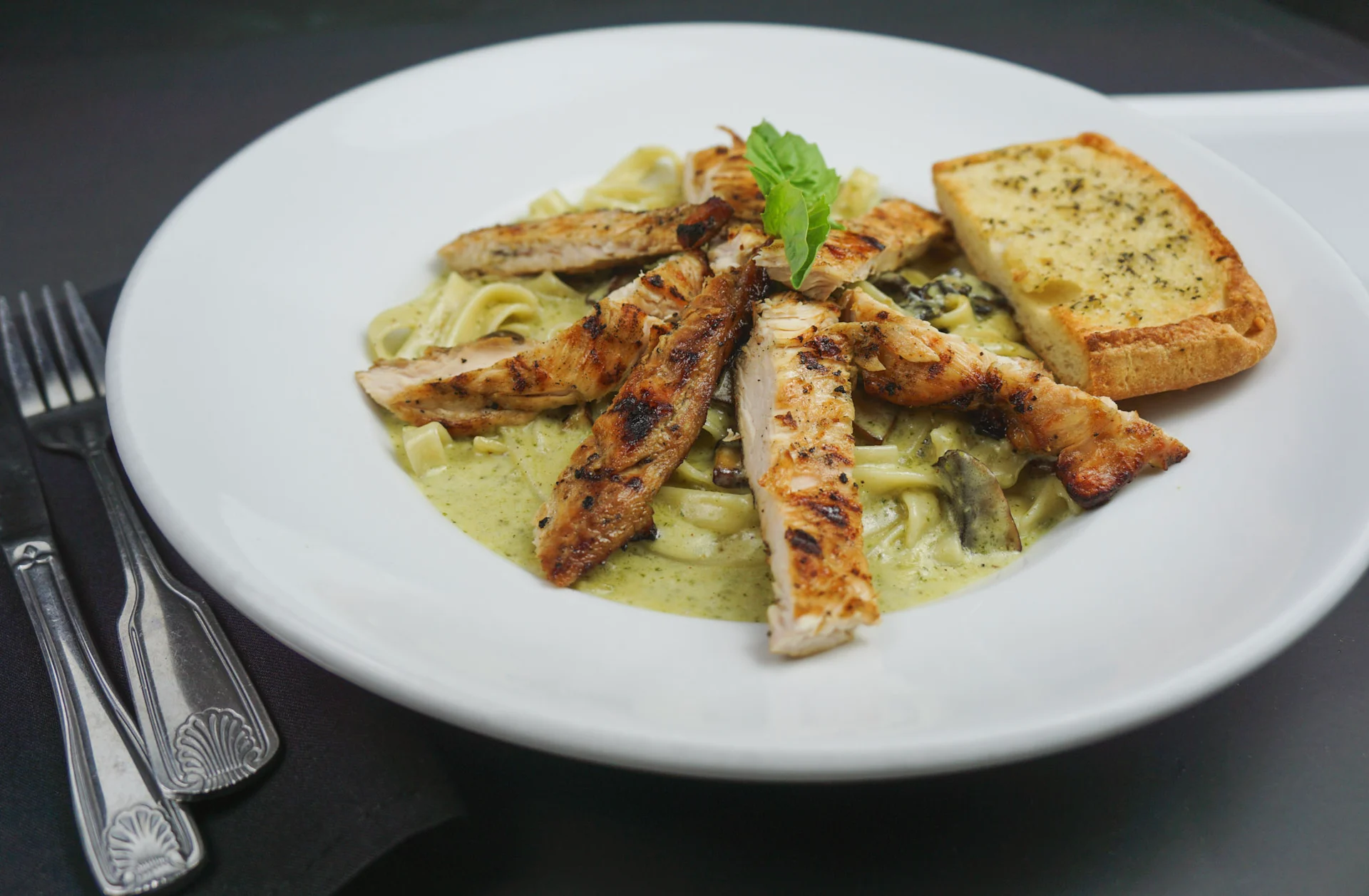 Fettuccini Pasta In A Cream Alfredo Pesto Sauce, Portobello Mushroom, Yellow Raisin, Roasted Pumpkin & Sesame seeds.