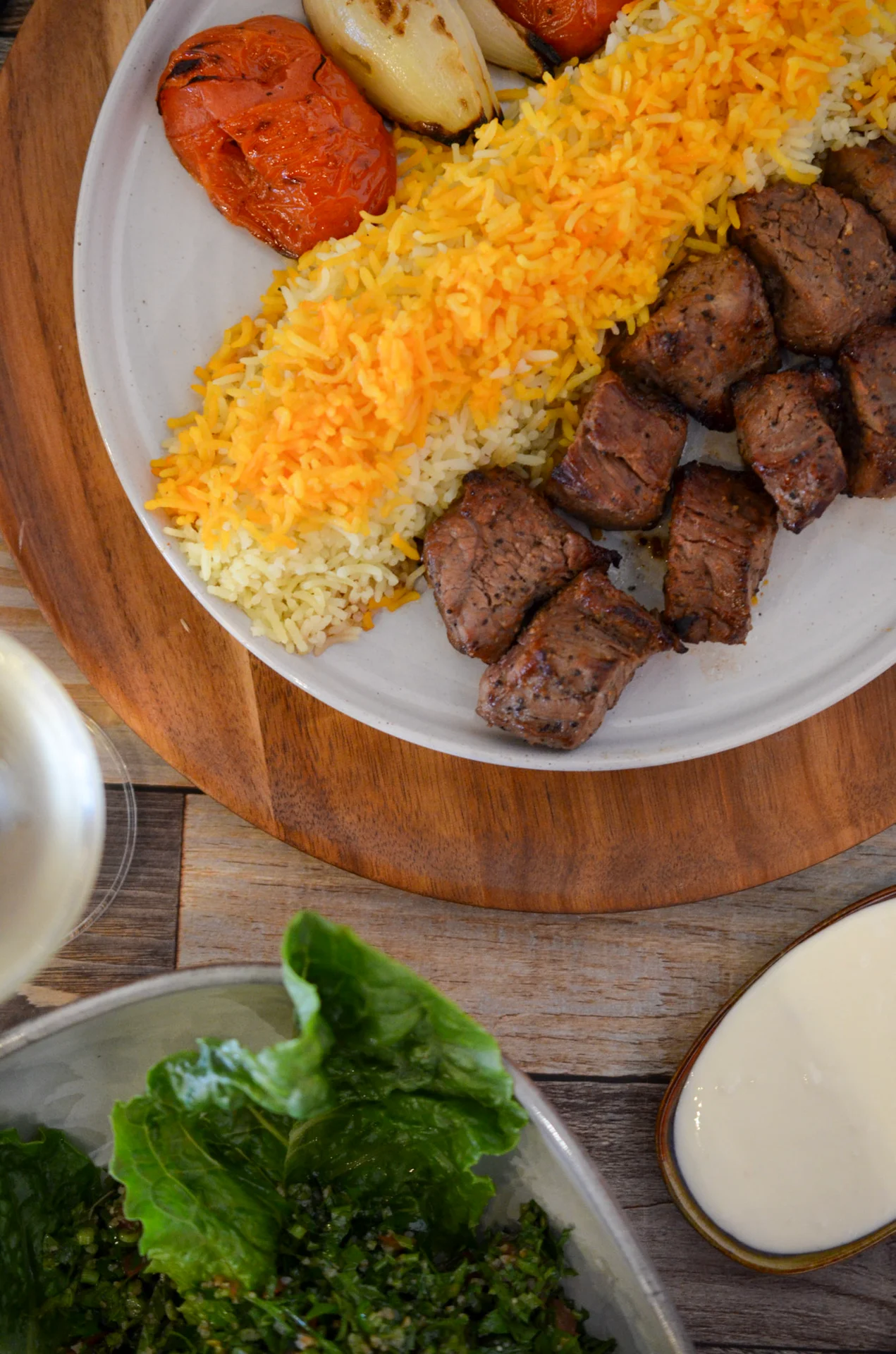 Two Skewers Of Beef Medallions Served w/Sliced Onion, Sumac, Creamy Garlic Sauce, Saffron Basmati Rice & Grilled Tomato And Onion