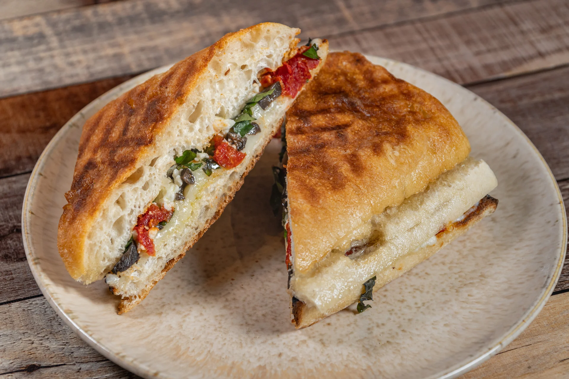 Mozzarella & Feta Cheese, Sun-Dried Tomato, Black Olives & Fresh Basil On Toasted Ciabatta Bread