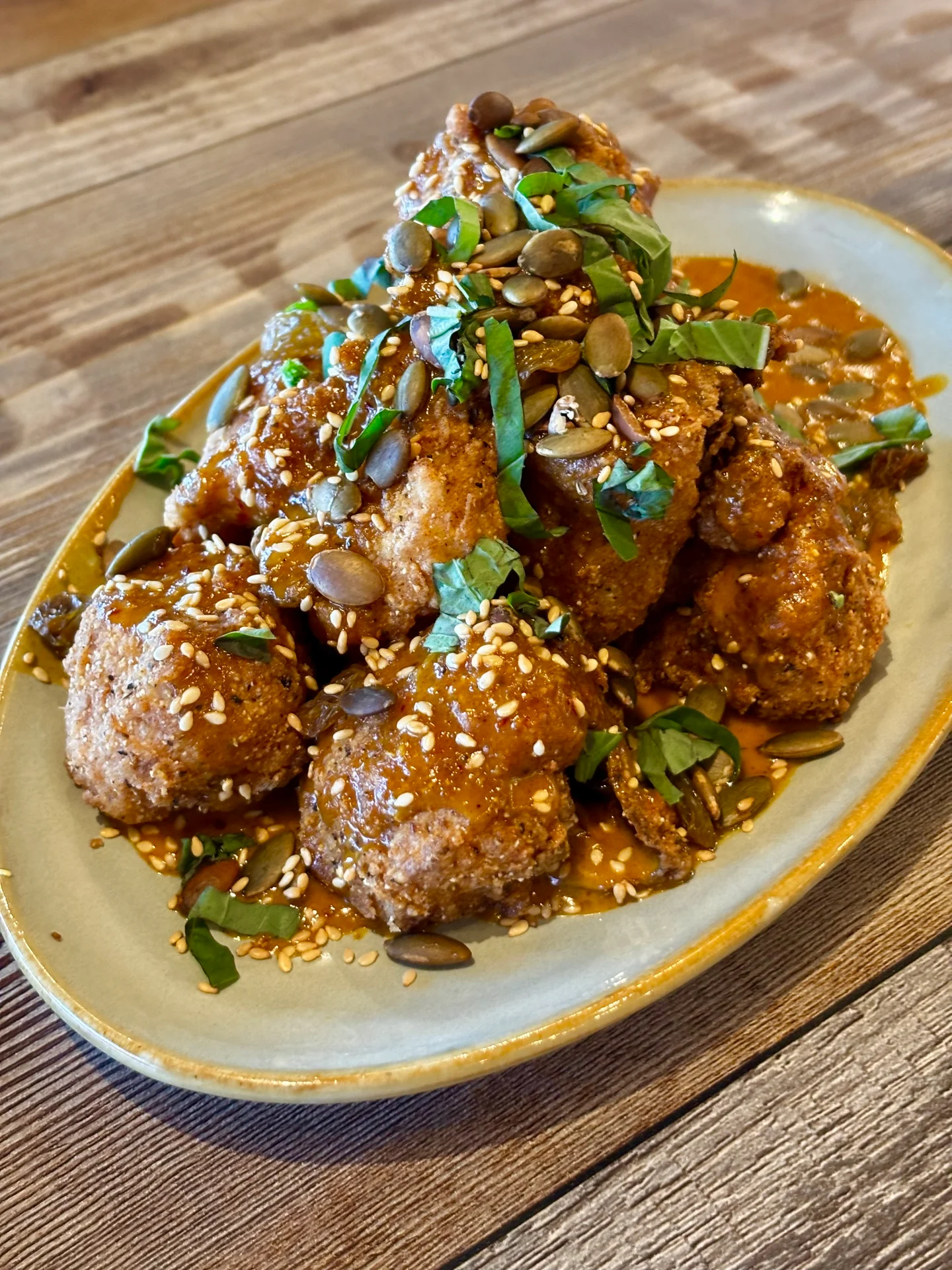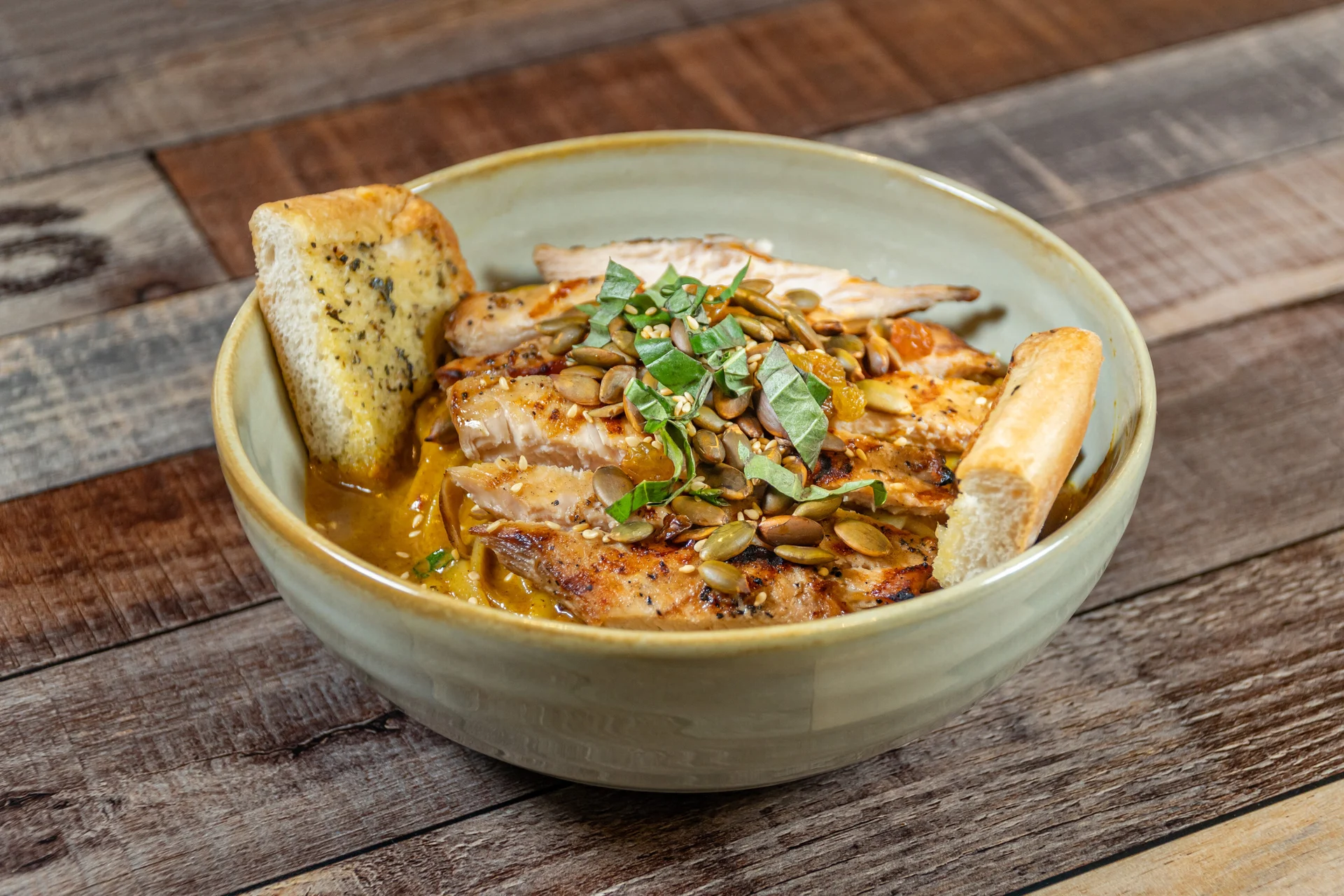 Lightly breaded, topped with a chipotle curry sauce, golden raisins, toasted sesame and pumpkin seeds
