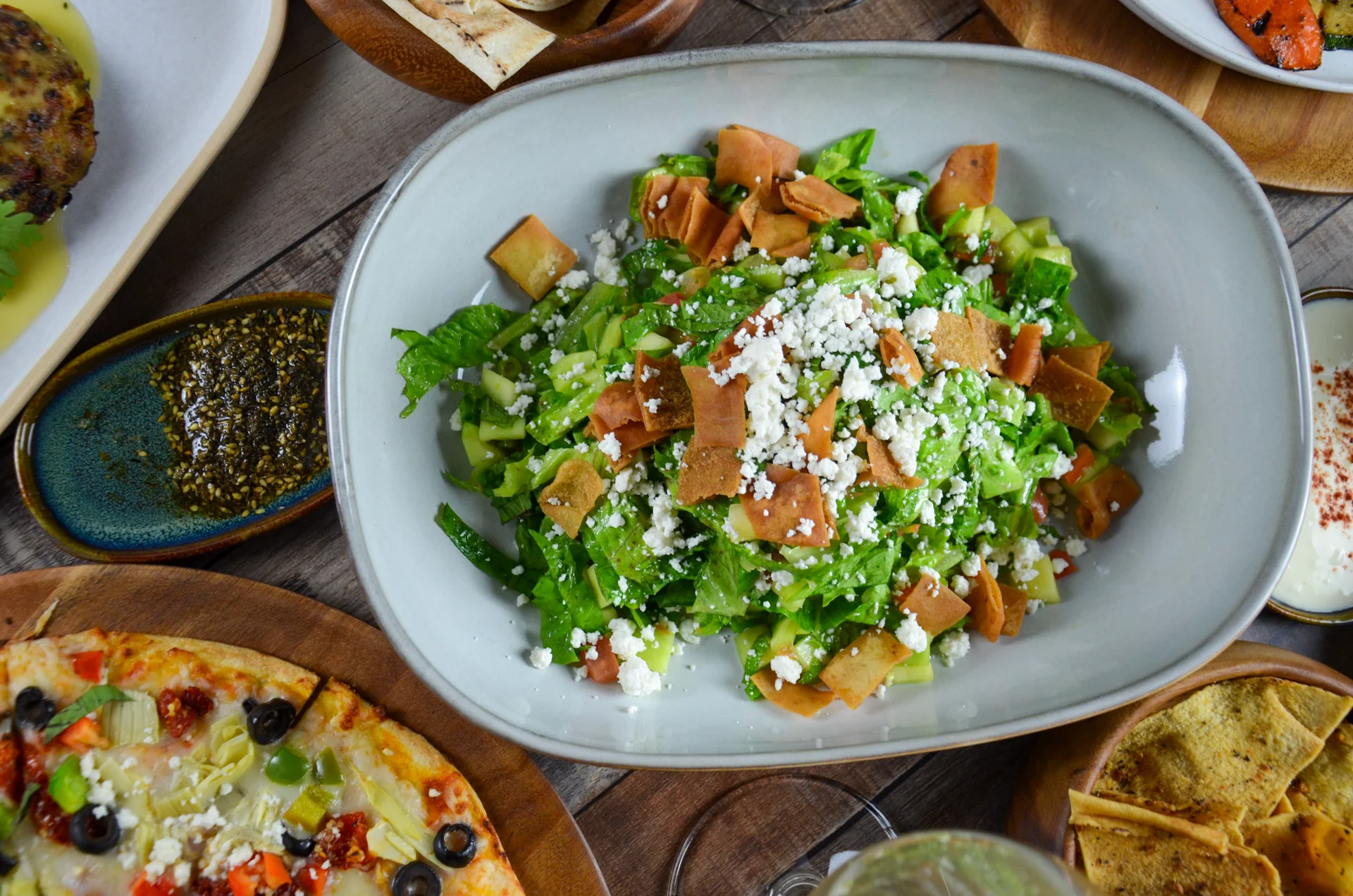Romaine, Cucumber, Tomato, Green Onion, Mint, Tossed In An Extra Virgin Olive Oil & Vinegar Dressing Topped With Feta Cheese & Crispy Pita Chips
