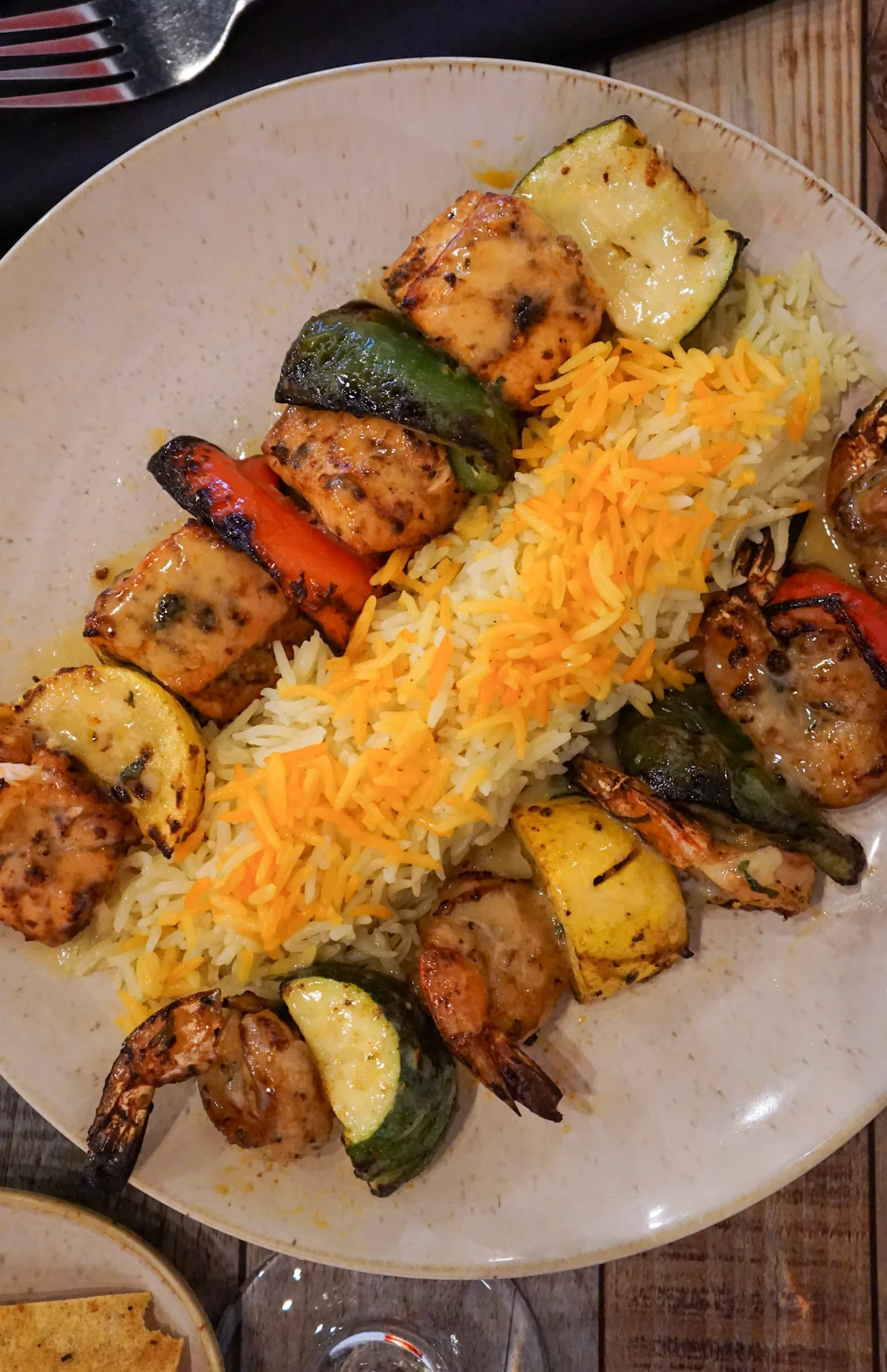 Two Skewers Of Grilled Shrimp, Salmon & Vegetables Topped With Lemon Butter Sauce & Served w/Saffron Basmati Rice