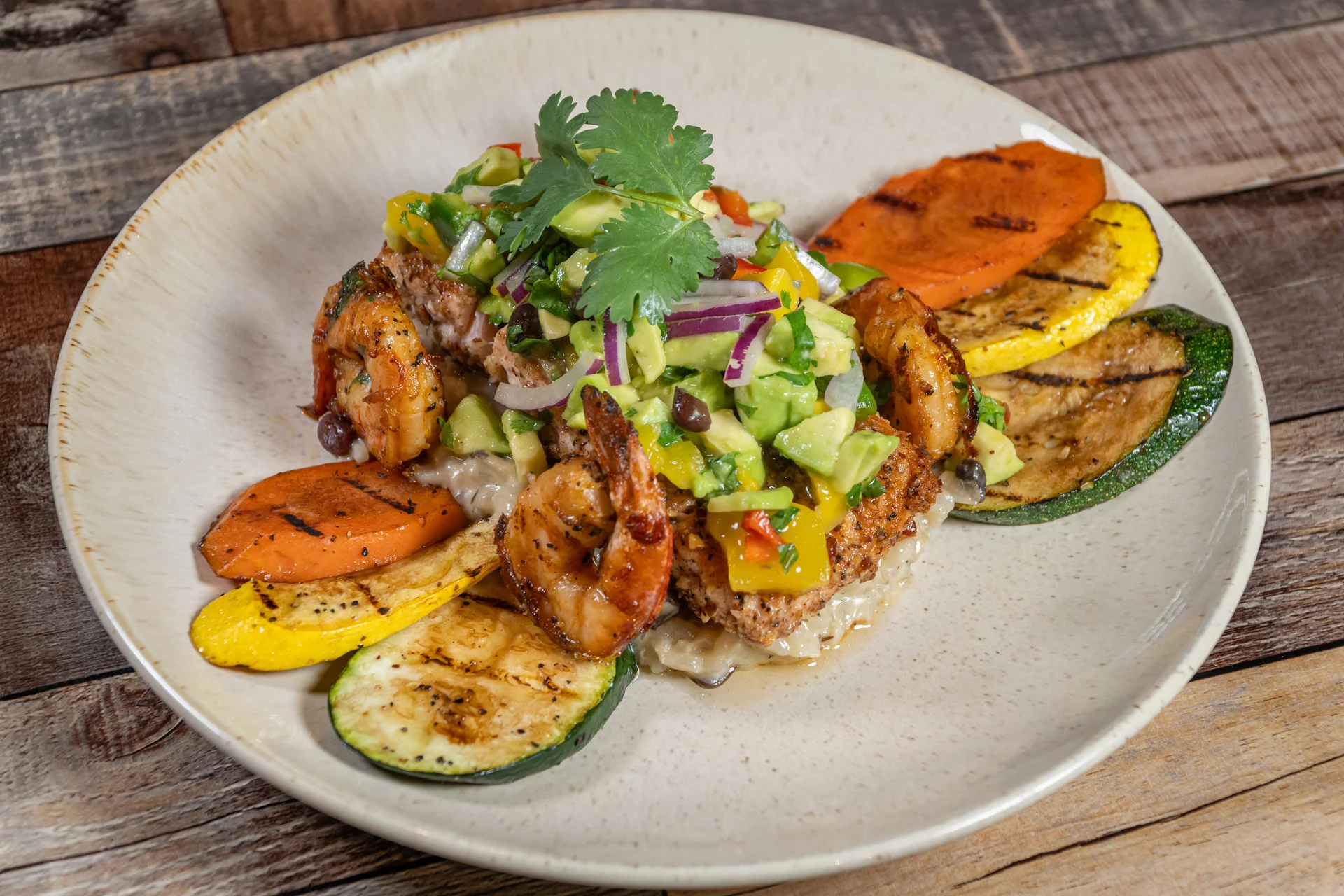 Topped With Grilled Shrimp & Avocado Mango Black Bean Salsa Served w/Creamy Wild Mushroom Risotto & Grilled Vegetables